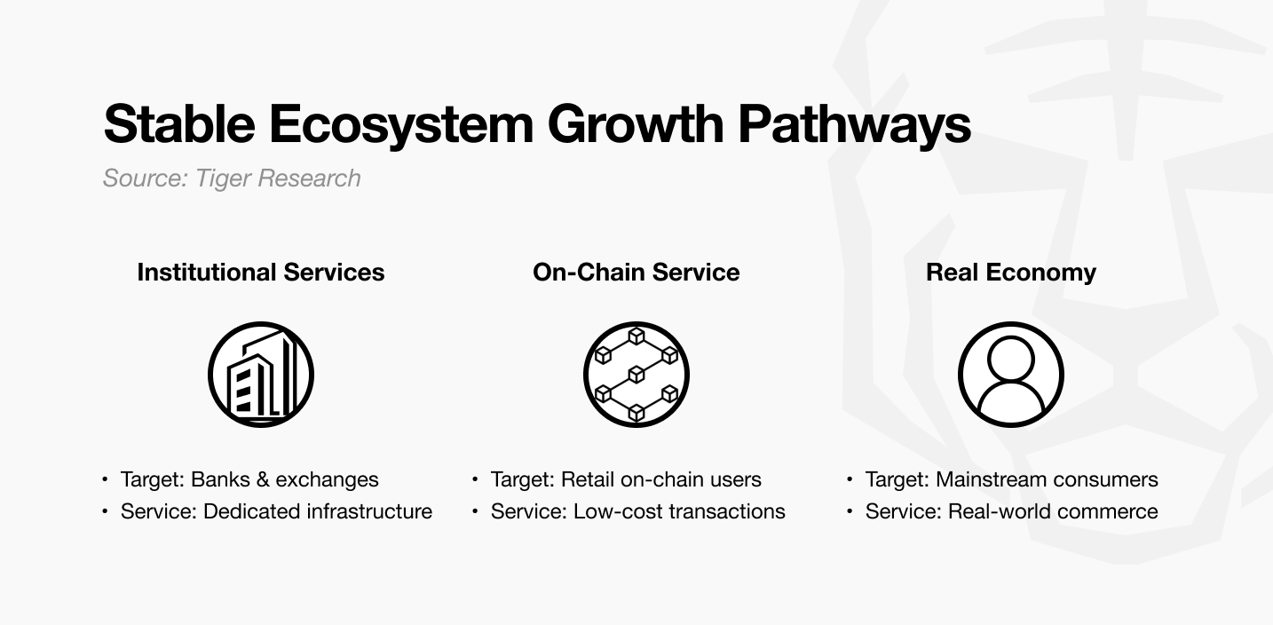 이런 변화는 스테이블의 비즈니스 모델을 진화시킨다. 단순한 블록체인 네트워크에서 글로벌 결제 인프라 제공업체로 전환된다. 상점에게는 결제 단말기를, 소비자에게는 디지털 지갑을 제공하며 각각에서 수수료를 확보한다.