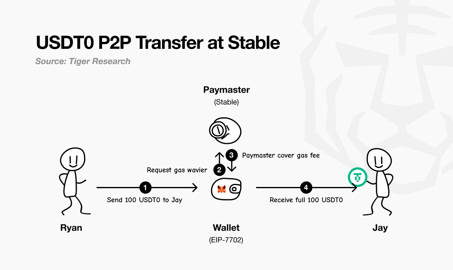 예를 들어서 스테이블을 사용하고 있는 Ryan이 Jay에게 100 USDT0를 보낸다면, Ryan이 메타마스크에서 "Jay에게 100 USDT0 전송"을 클릭하게 된다면 뒤어에서는 EIP-7702가 적용된 Ryan의 지갑이 "이번 거래는 가스비를 면제해달라"고 요청한다. 그렇게 된다면, 페이마스터라는 일종의 '가스비 대납 서비스'가 Ryan 대신 가스비를 완전히 부담한다. 그러면 Ryan의 USDT0 잔액에서 100개만 빠지고 가스비는 전혀 차감되지 않으며, Jay가 100 USDT0를 받는다.