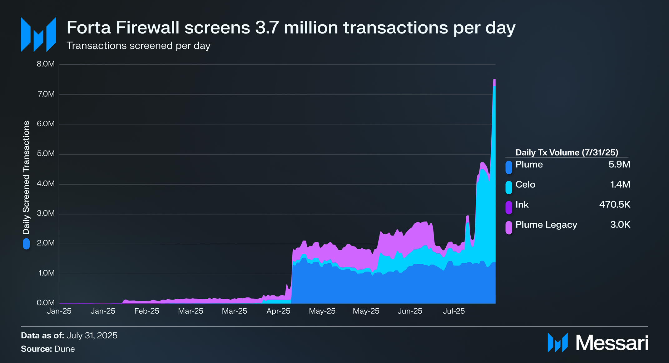 • 거래 스크리닝 거래량이 2025년 4월부터 7월까지 2,263% 급증했으며, 포르타 파이어월(Forta Firewall)이 총 2억 7,100만 건의 거래 스크리닝을 돌파하고 7월에 일평균 370만 건의 거래를 기록했다.