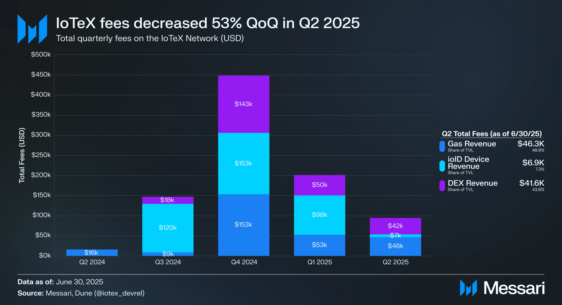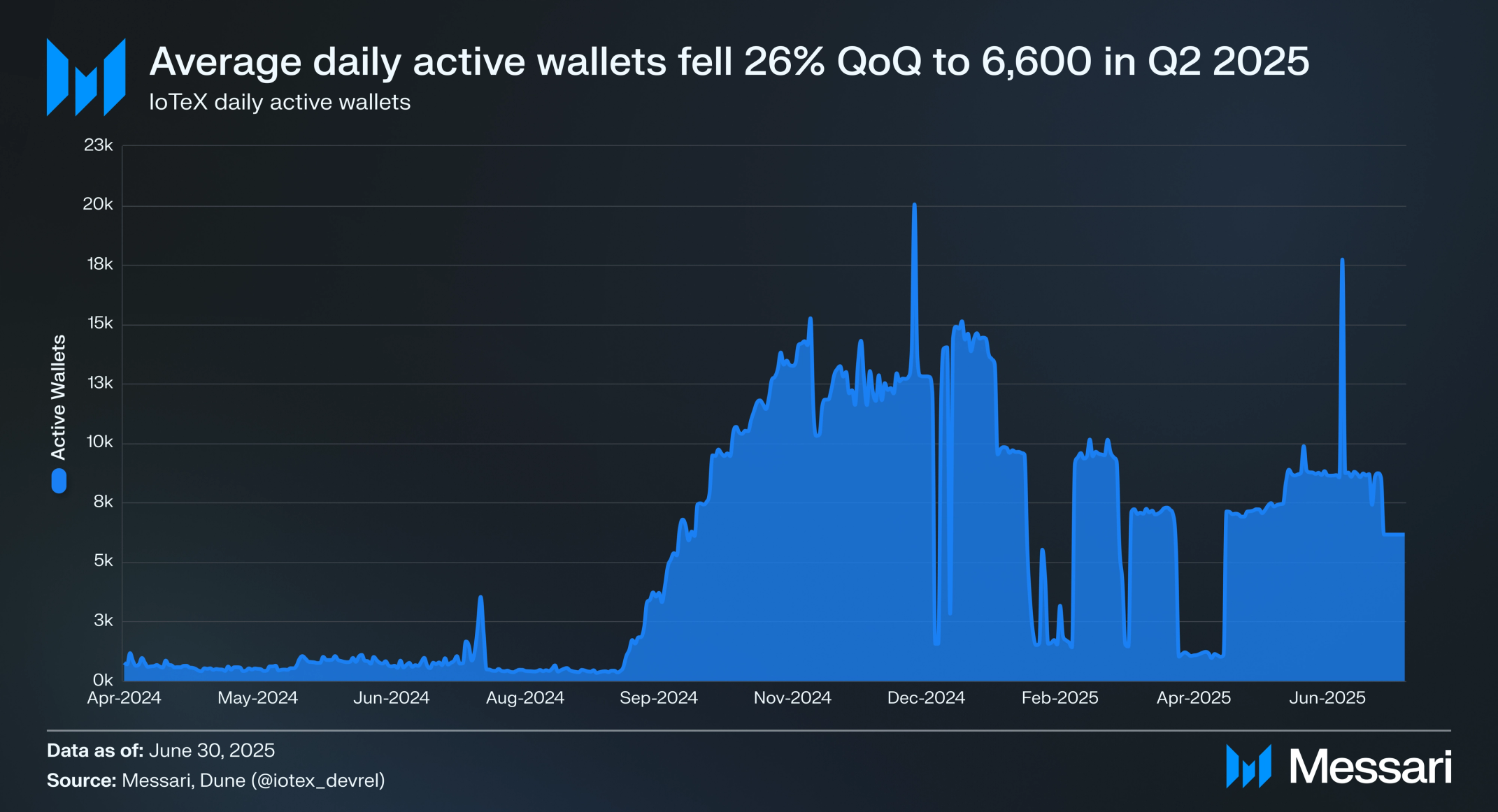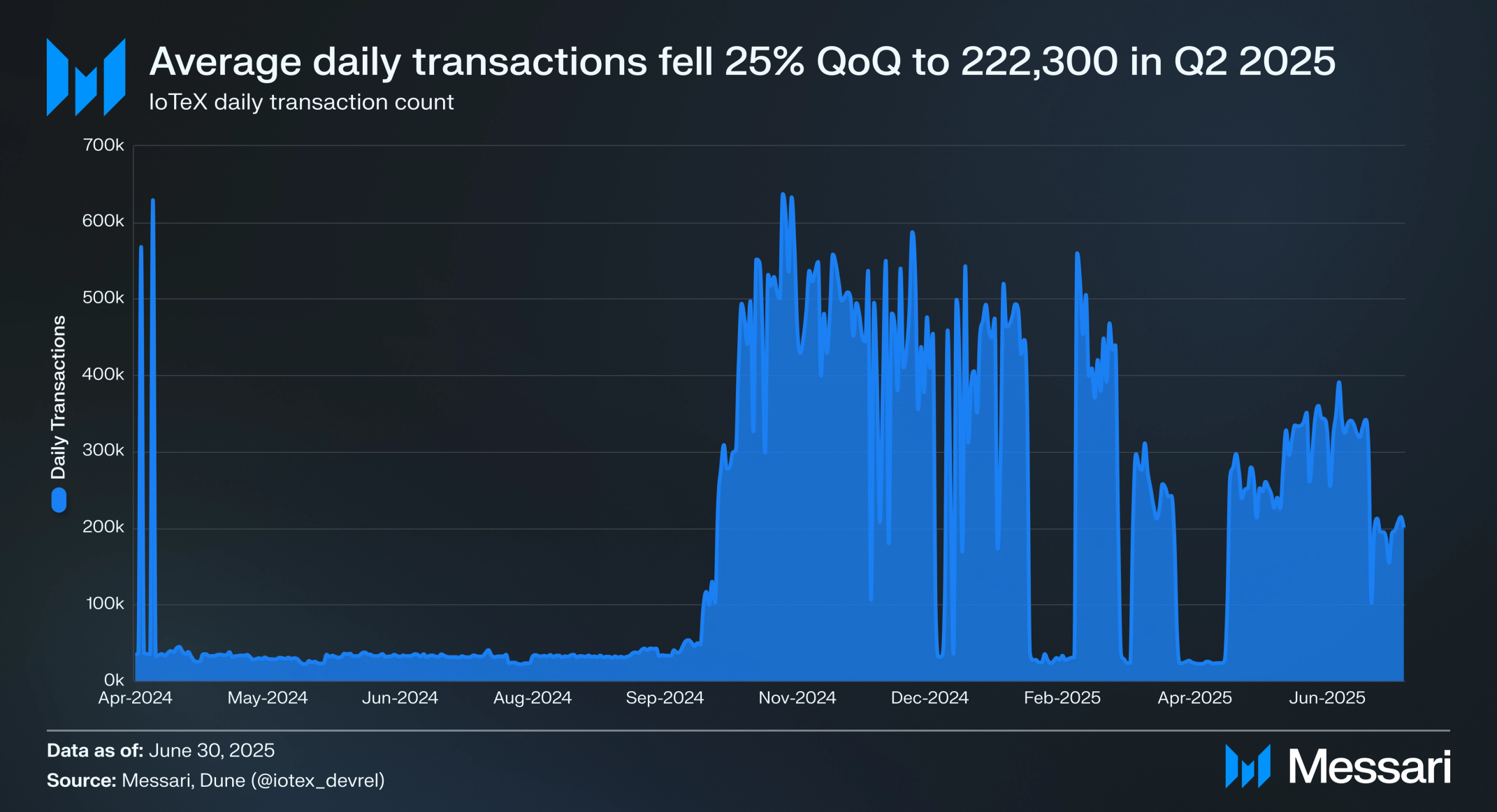 2025년 2분기에 아이오텍스 활동은 일평균 거래가 296,500건에서 222,300건으로 전분기 대비 25% 감소하고, 일평균 활성 지갑이 8,900개에서 6,600개로 전분기 대비 26% 감소하여 연속 두 번째 분기 감소를 기록했다. 프로토콜의 총 수수료는 전분기 대비 53% 감소한 94,800달러를 기록했으며, 이는 ioID 활성화 수수료가 6,900달러로 93% 감소, 가스 수수료가 46,000달러로 17% 감소, DEX 수수료가 42,000달러로 12% 감소한 것에 기인한다. 121명의 활성 대리인이 36억 IOTX(순환 공급량의 38% 또는 7,500만 달러)를 스테이킹했으며, 이는 전분기 대비 2%(1억 5,100만 IOTX) 감소한 수치다.