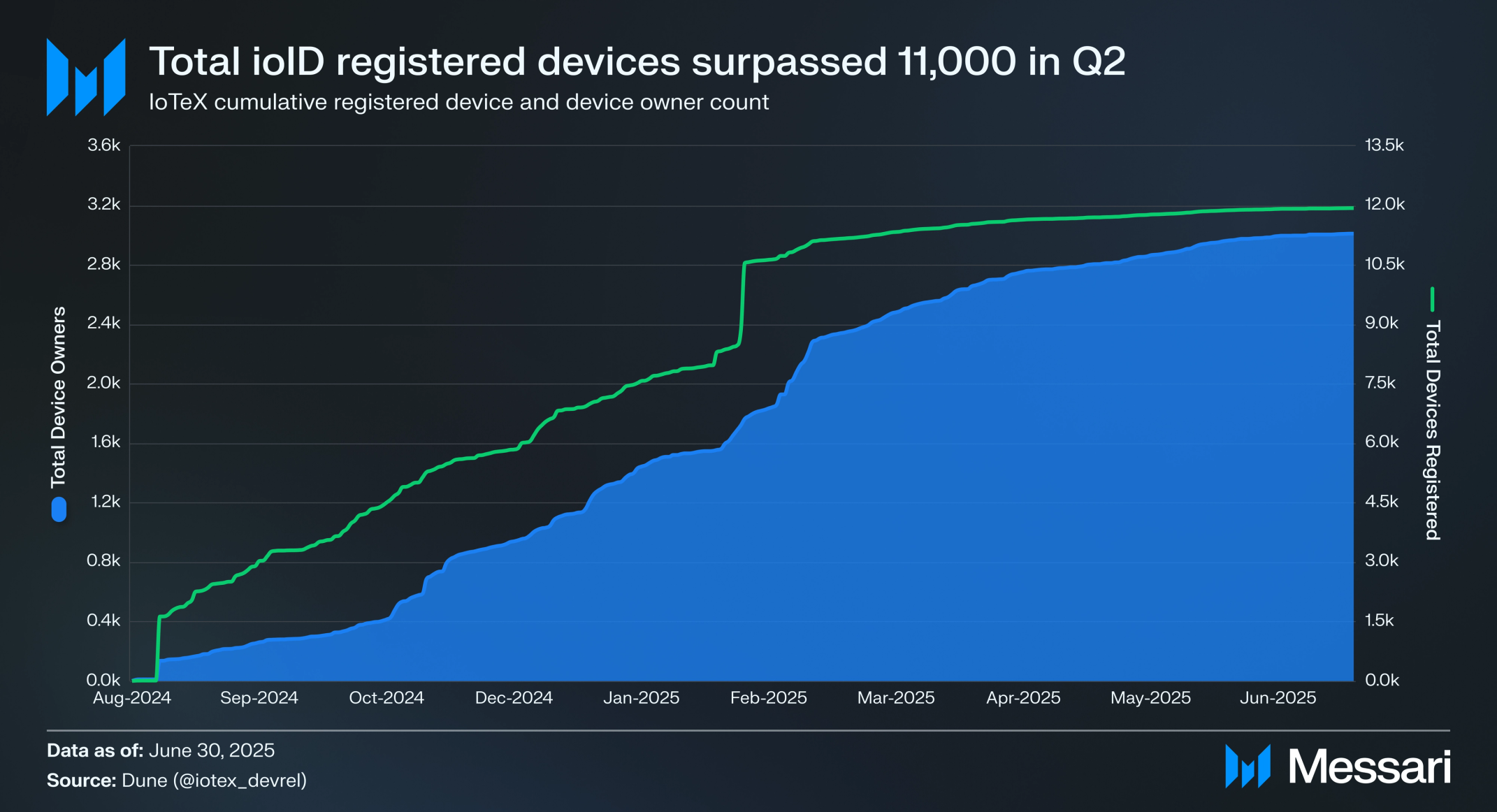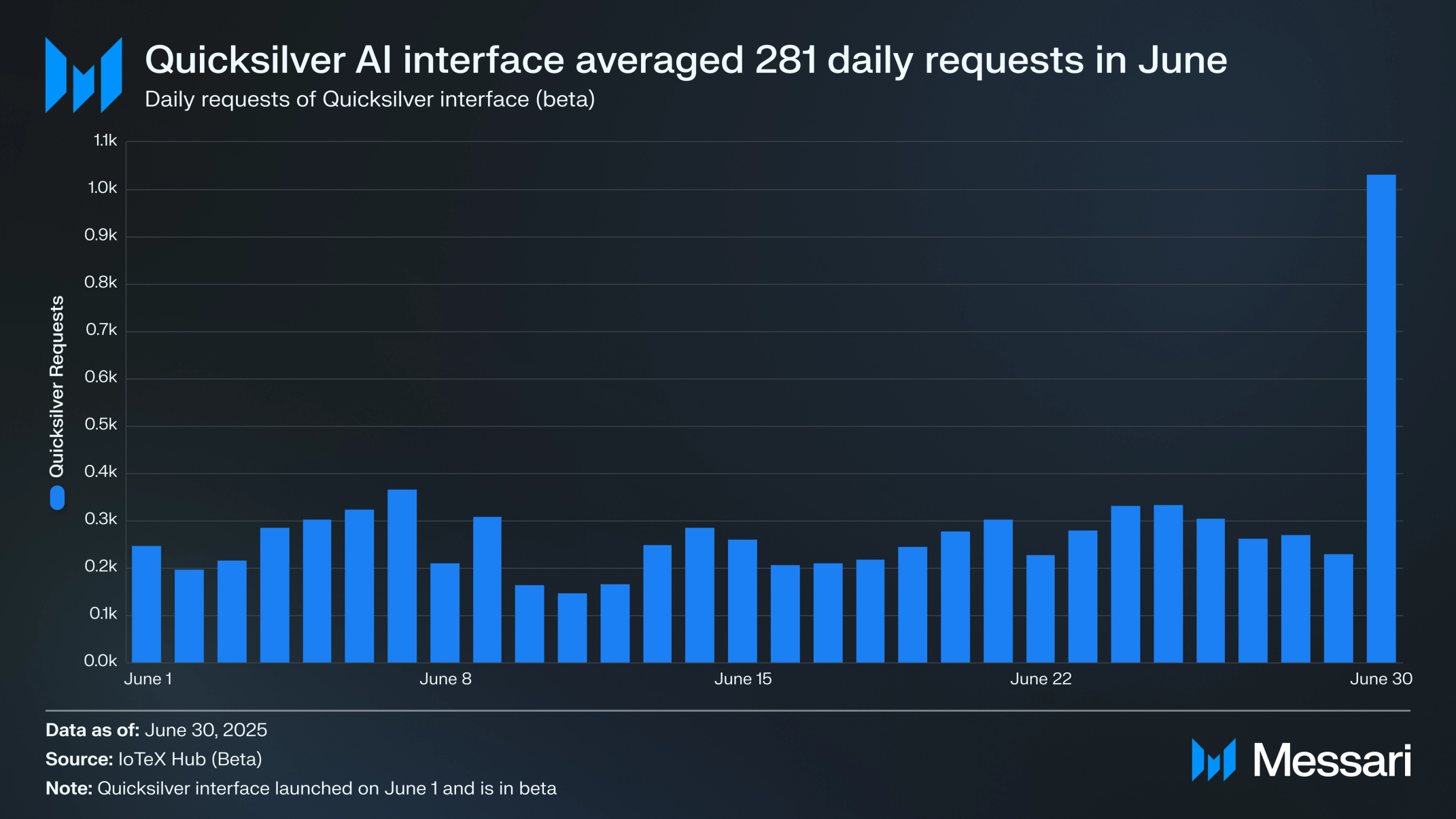 낮은 활동에도 불구하고, 아이오텍스는 퀵실버의 첫 번째 버전을 출시하여 2분기에 인프라를 확장했다. 퀵실버는 개발자가 구축하고 사용자가 실시간 실제 세계 데이터를 사용하는 AI 에이전트와 상호작용할 수 있게 한다. 아이오텍스는 맥락 인식 AI를 위한 계획된 도메인별 데이터셋인 렐름스를 특징으로 하는 AI 인프라 로드맵을 공개했다. 아이오텍스 L1은 블록 시간을 2.5초로 절반으로 줄이고 이론적 처리량을 초당 2,000건의 거래로 증가시킨 v2.2로 업그레이드되었다. ioID 장치 등록이 2분기에 둔화되었지만, 프로토콜은 디핀, 아이덴티티, AI 수직 분야에서 계속 발전하고 있다.