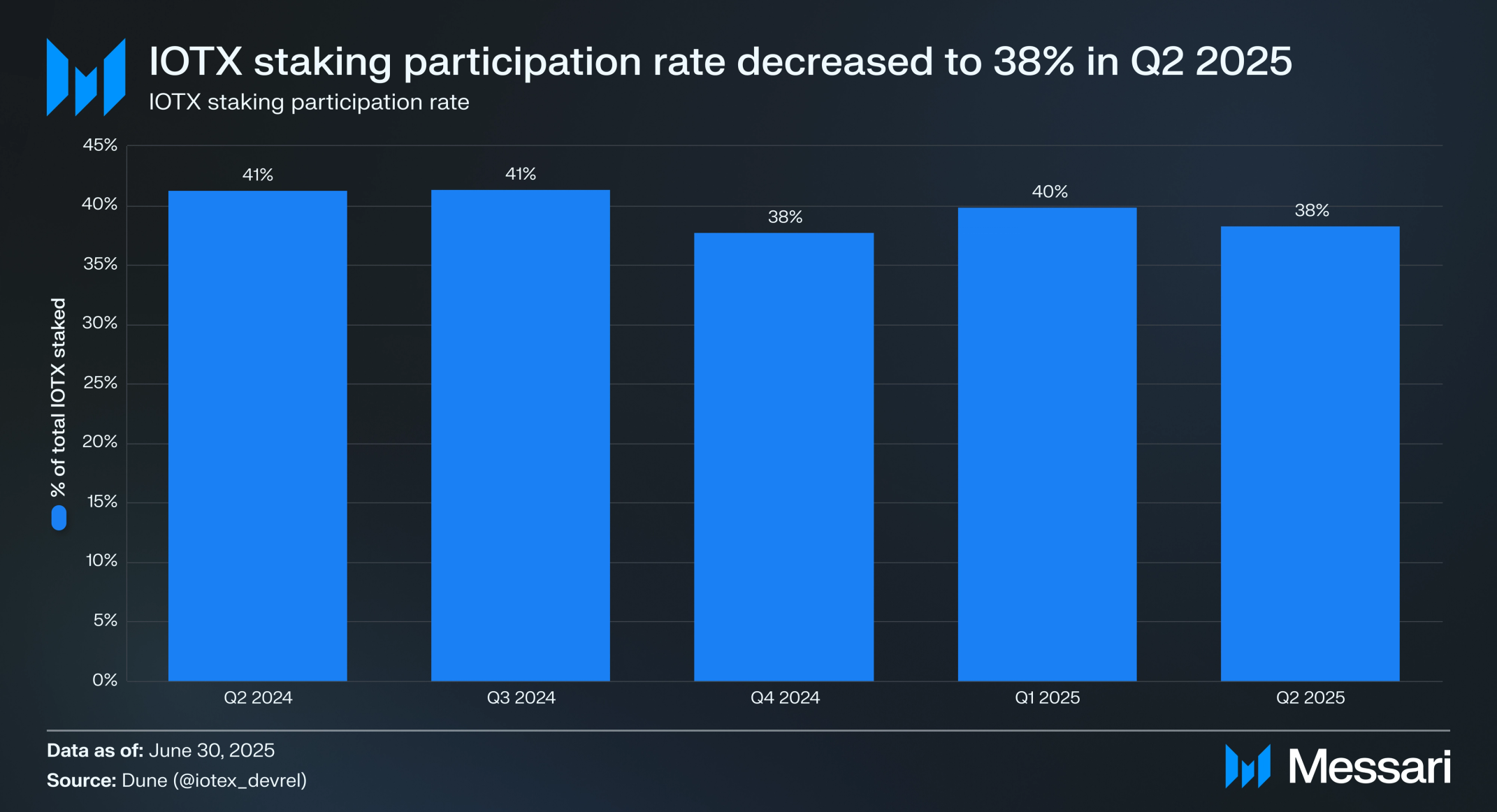 2분기 종료 시점에서 121명의 활성 대리인이 아이오텍스 L1 블록체인을 보호했다. 36억 IOTX(순환 공급량의 38% 또는 7,500만 달러)가 스테이킹되었으며, 이는 전분기 대비 2%(1억 5,100만 IOTX) 감소한 수치다.