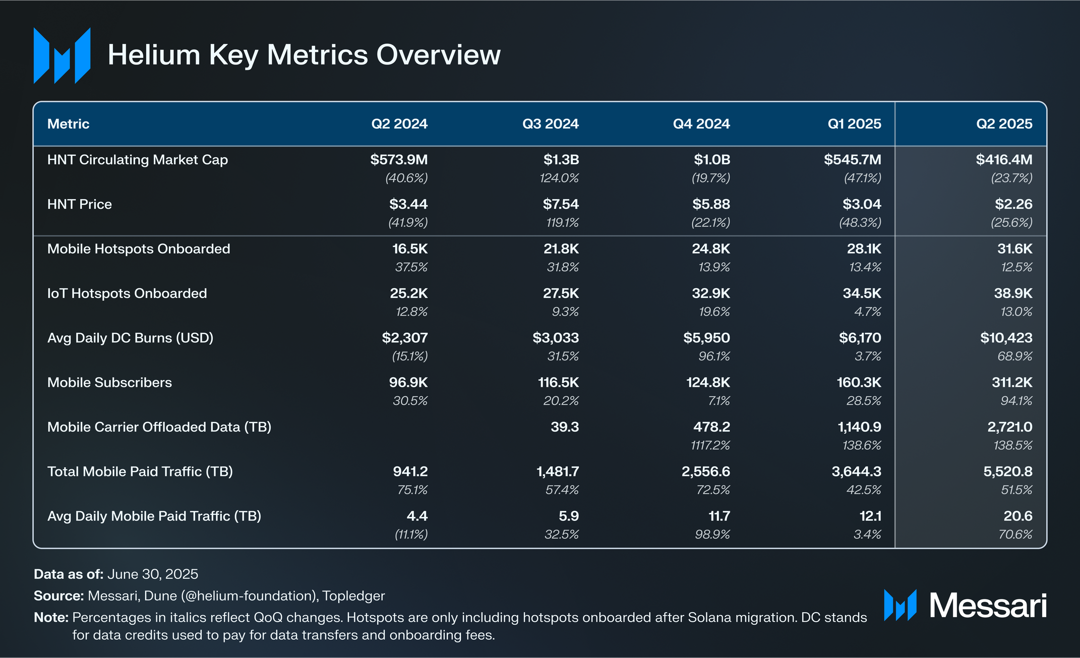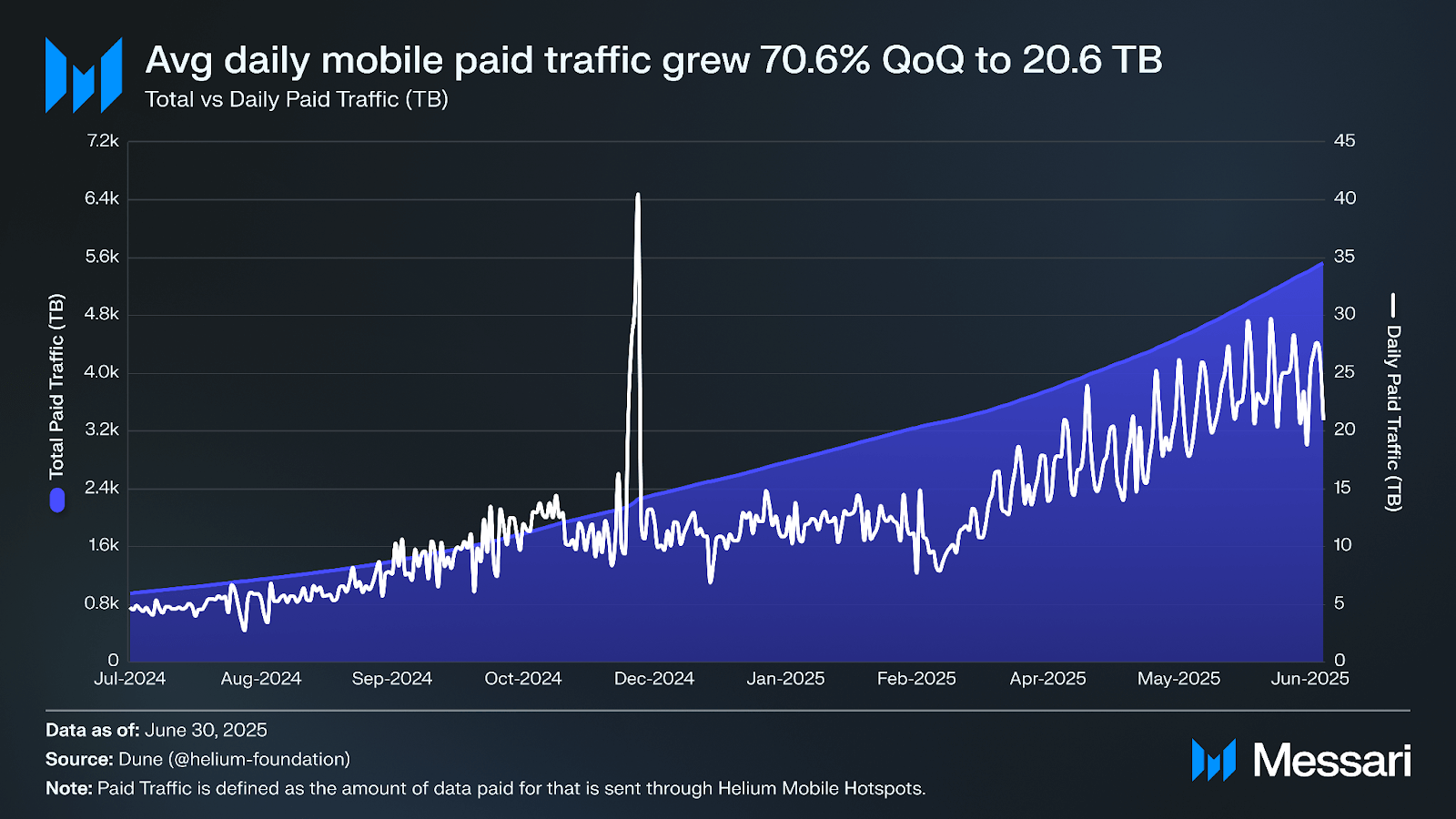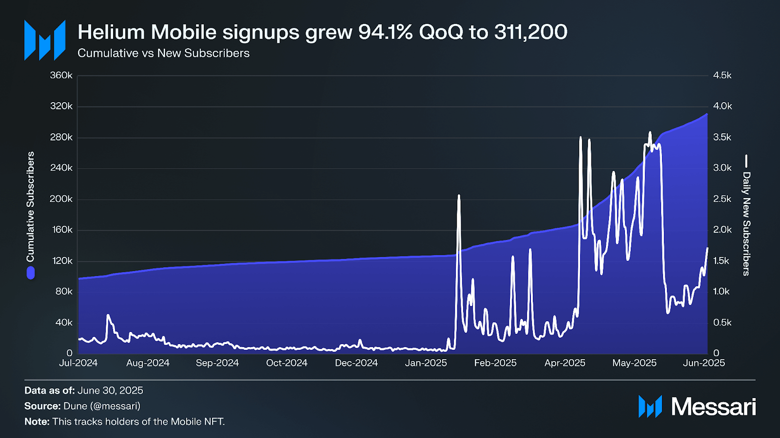2025년 2분기는 헬륨 네트워크의 가속화된 성장과 주류 통신 산업과의 증가하는 통합을 보여주었다. 네트워크는 새로운 파트너십, 특히 AT&T와의 파트너십에 의해 추진되어 전분기 대비 138.5% 증가한 누적 캐리어 데이터 오프로드 2,721TB라는 이정표를 달성했다. 이러한 확장은 사용자 채택에서도 반영되어 헬륨 모바일 가입이 94.1% 증가하여 311,200개를 넘었다.