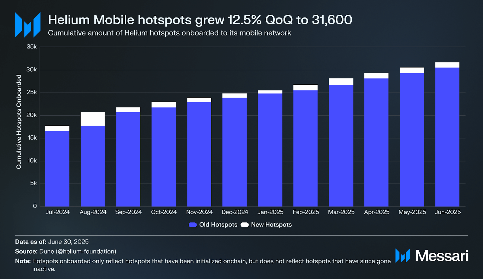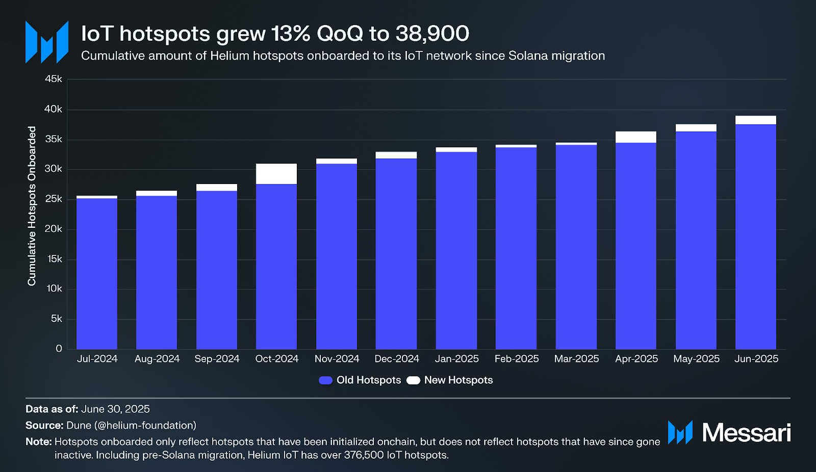 IoT 핫스팟은 전분기 대비 13% 증가하여 2025년 2분기를 2023년 4월 솔라나 마이그레이션 이후 온보딩된 38,900개의 핫스팟으로 마감했다. 마이그레이션 이전에 헬륨은 342,000개 이상의 활성 핫스팟을 보유했으며, 네트워크 총계를 380,900개 이상으로 만들었다.