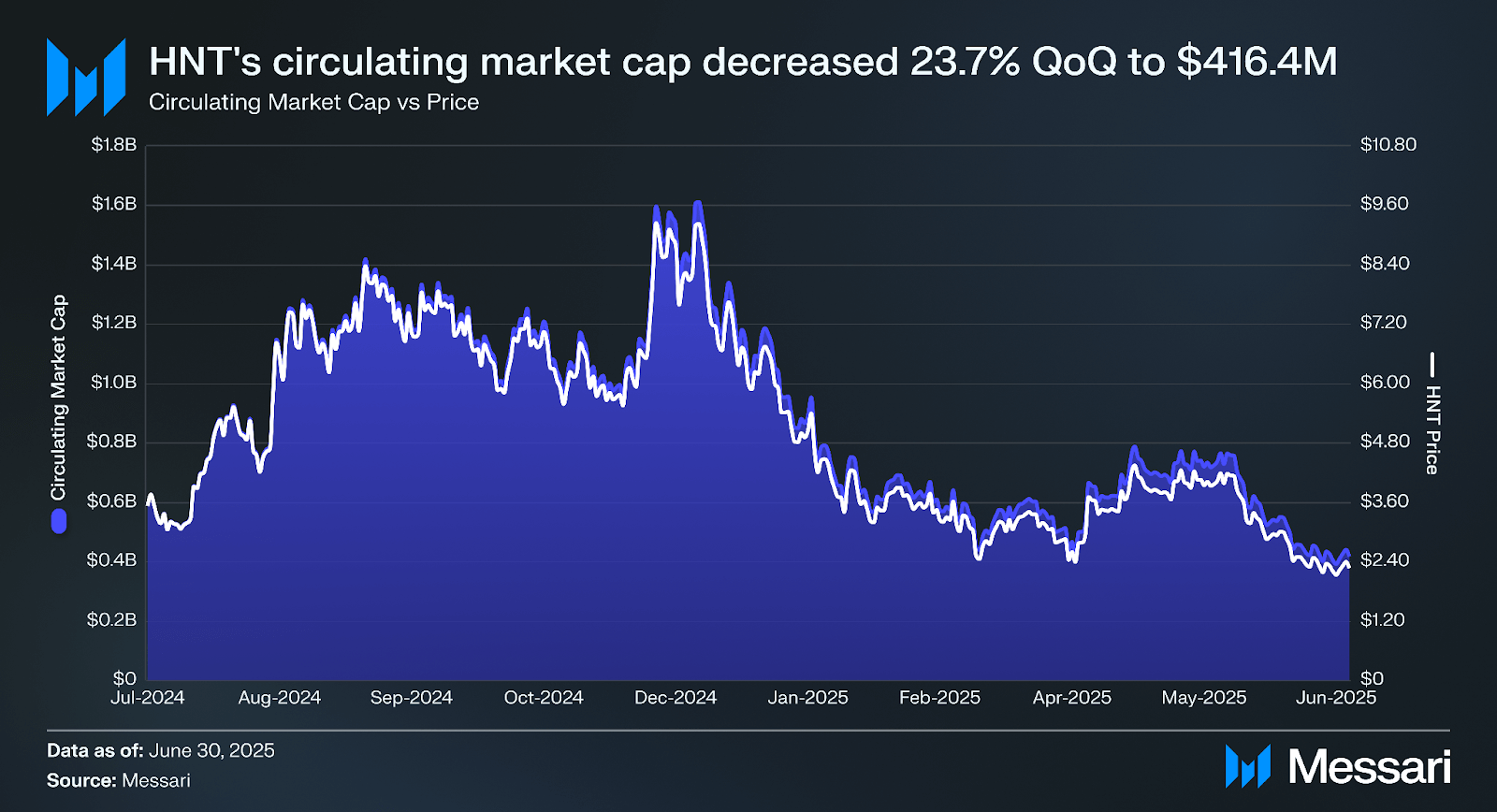 2025년 2분기에 HNT의 순환 시가총액은 전분기 대비 23.7% 감소하여 5억 4,570만 달러에서 4억 1,640만 달러가 되었으며, 시가총액 순위는 96위에서 122위로 하락했다. HNT의 가격은 25.6% 하락하여 3.04달러에서 2.26달러가 되었다. 헬륨 네트워크 토큰(HNT)은 네트워크의 주요 토큰이다. 헬륨 DAO에서 배포되고 인플레이션 방출을 통해 발행된 후 성과와 참여도(즉, 유틸리티 점수)에 따라 서브DAO에 배포된다. HNT에는 두 가지 주요 기능이 있다:
