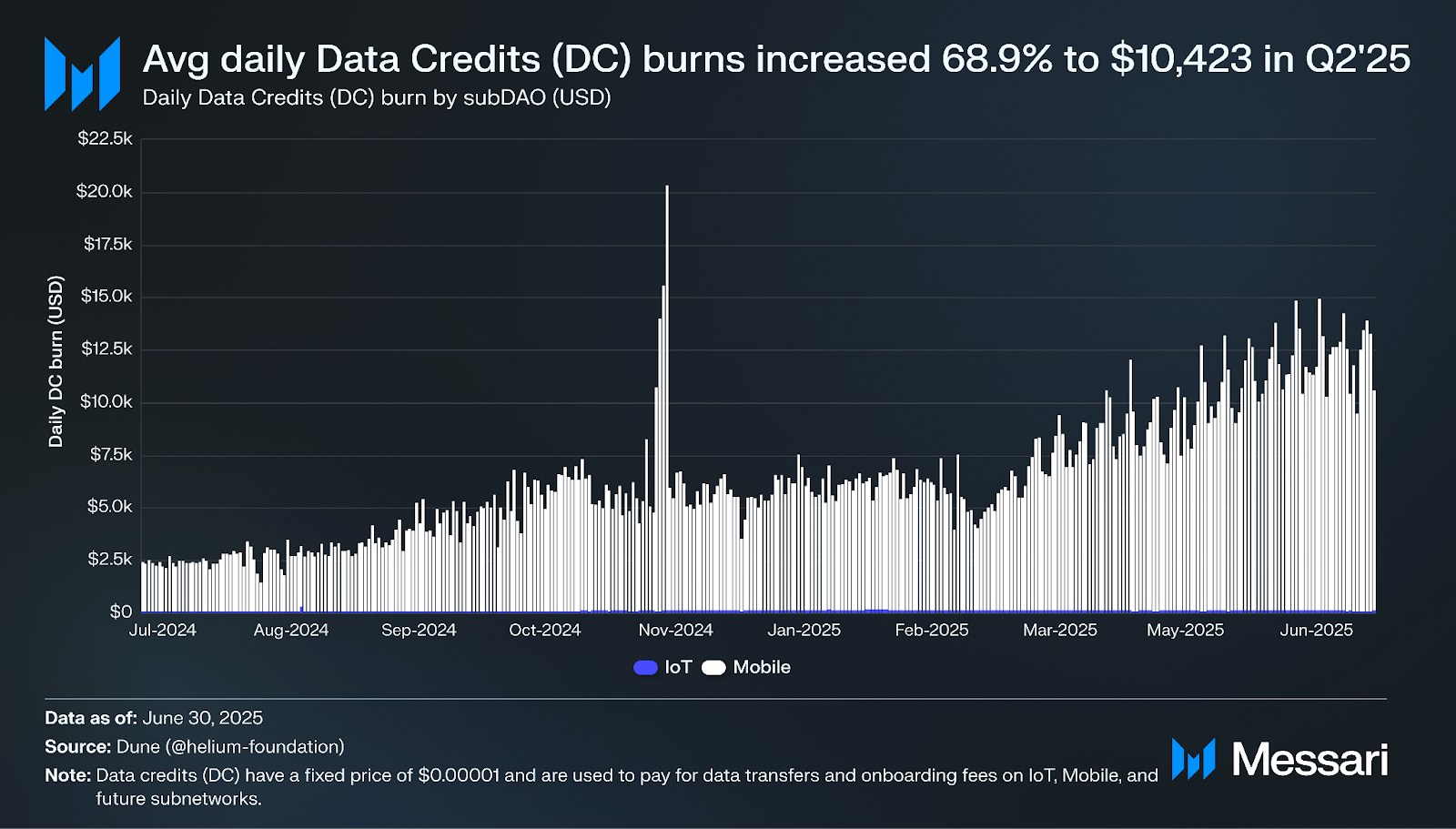 데이터 크레딧(DC)은 0.00001달러의 고정 가격을 가지며 IoT, 모바일, 그리고 미래 서브네트워크에서 데이터 전송과 온보딩 수수료를 지불하는 데 사용된다. 2025년 2분기 말 총 DC 소각은 310만 달러였다. 일평균 DC 소각은 전분기 대비 68.9% 증가하여 6,170달러에서 10,423달러로 늘었다. 모바일 네트워크는 일일 DC 소각의 10,311달러를 차지하여 분기 총계의 98.9%를 나타냈으며, IoT 서브DAO는 112.83달러를 기여했다.