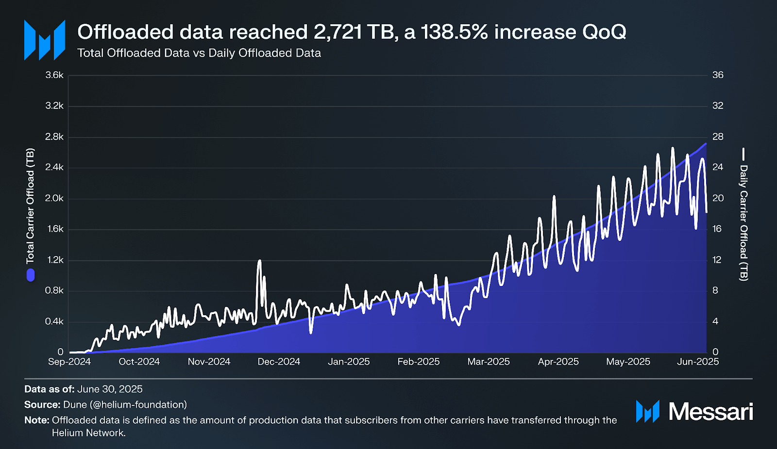 오프로드된 데이터는 다른 통신사의 사용자들이 헬륨 네트워크를 통해 전송한 프로덕션 데이터의 양이다. 2025년 2분기에 누적 전체 오프로드된 데이터(TB)는 1,140.9TB에서 2,721TB로 138.5% 증가했다. 최신 통계는 여기에서 볼 수 있다.