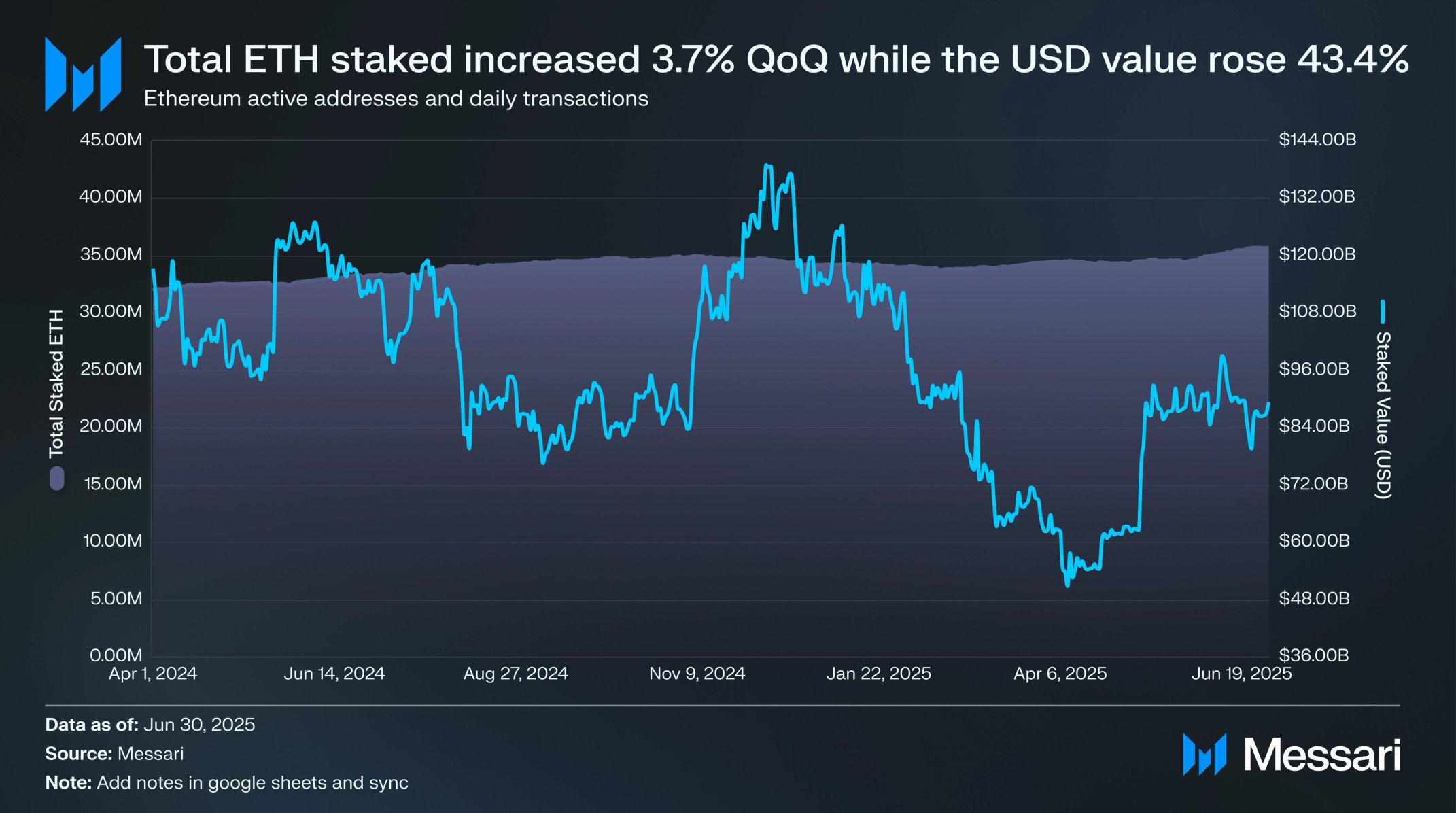 이더리움 스테이킹 활동은 2025년 2분기에 가속화되었다. 총 스테이킹된 ETH는 전분기 대비 4% 증가하여 3월 말 3,440만 ETH에서 6월 30일까지 3,570만 ETH로 늘어났다. 이로써 스테이킹 비율은 1분기의 28.5%에서 29.6%로 증가했다.