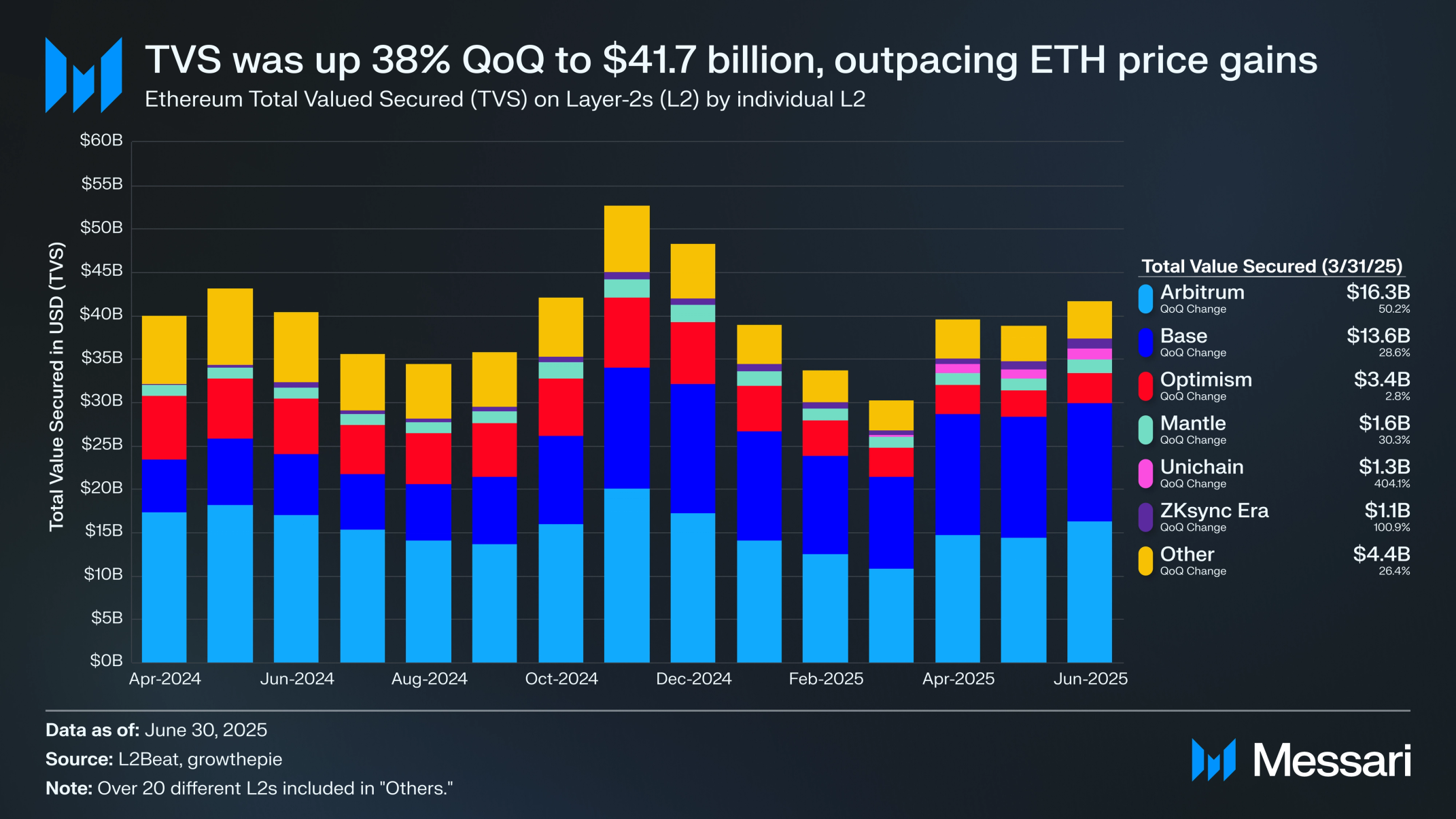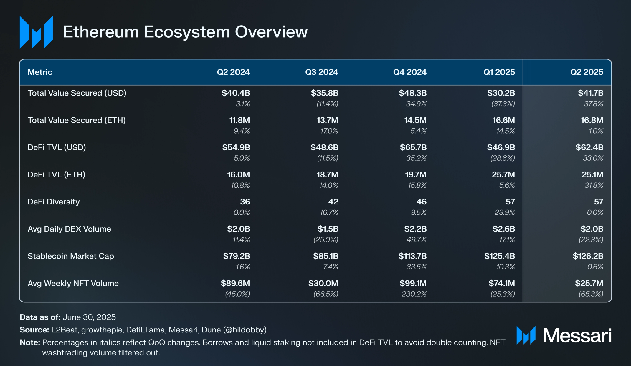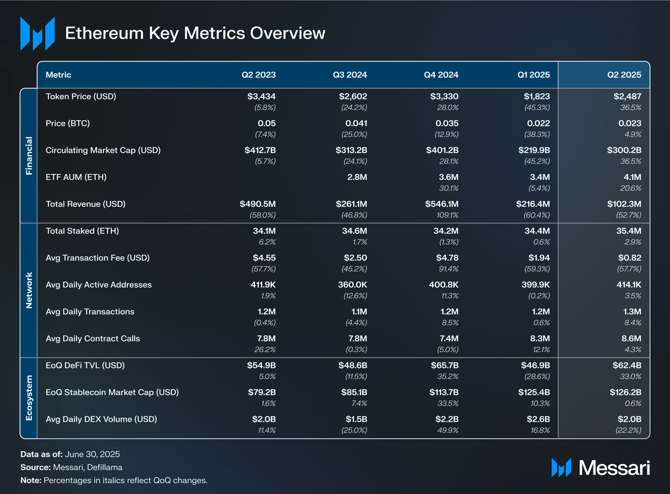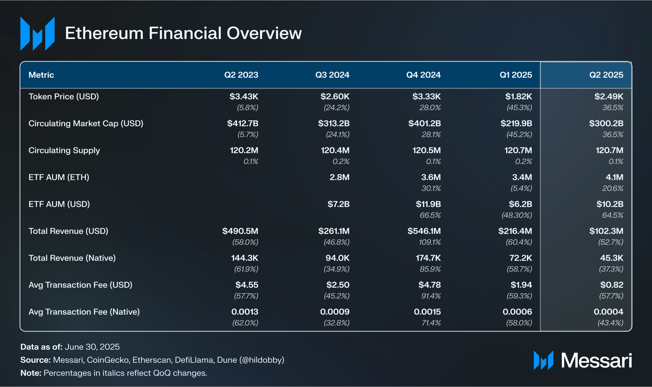 ETH 가격이 전분기 대비 45% 하락하여 3,330달러에서 1,823달러로 떨어져 3월에 시가총액 2,199억 달러로 마감한 어려운 2025년 1분기 이후, 이더리움은 2분기에 반등했다. ETH 가격은 분기 내에 37% 상승하여 2,487달러로 마감했으며, 시가총액은 3,002억 달러로 마감했다. 1년 넘게 처음으로 ETH는 전분기 대비 4.9%포인트로 BTC를 앞질렀다. BTC는 112,000달러에서 신고가를 기록한 후 전분기 대비 29.9% 상승한 107,200달러로 분기를 마감했다. 또한 ETH는 SOL(+11%), TRX(+16%), BNB(+26%) 등 경쟁 L1들을 앞질렀다.