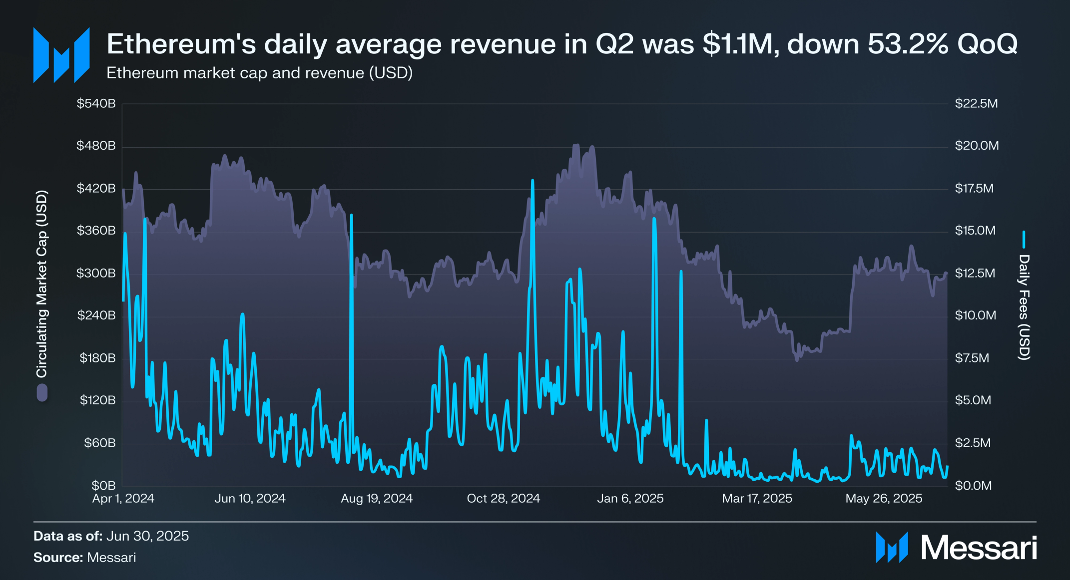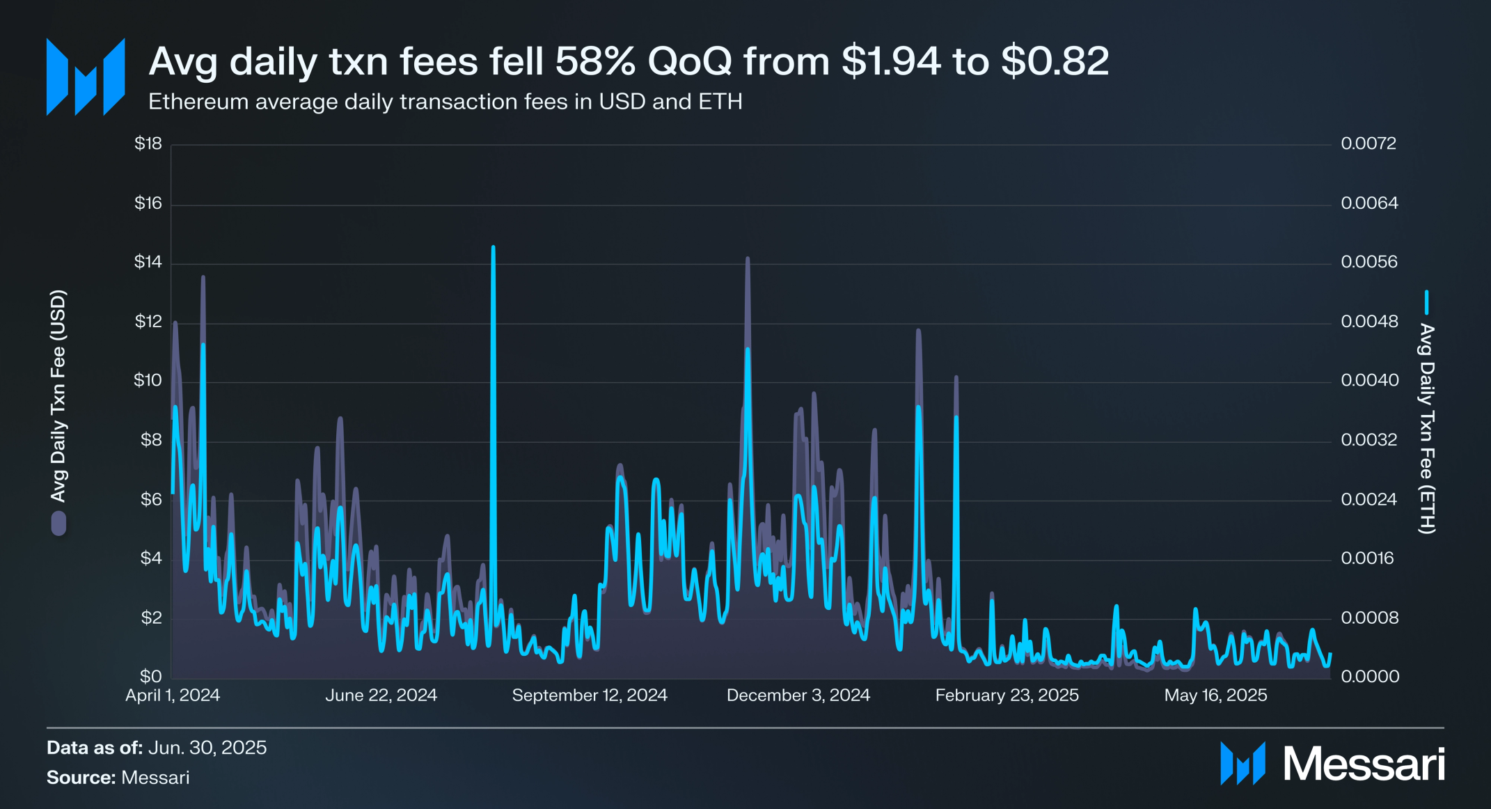 이더리움 트랜잭션 수수료는 네트워크 수요에 따라 자동으로 조정되고 소각되는 기본 수수료와 블록에 더 빠른 포함을 장려하기 위해 검증자에게 주는 선택적 팁인 우선순위 수수료로 구성된다. 이더리움 블록스페이스에 대한 수요 감소와 블록스페이스 용량 증가로 인해, 2분기 일일 평균 트랜잭션 수수료는 ETH 기준으로 전분기 대비 44% 감소한 0.00037 ETH를 기록했고, USD 기준으로는 전분기 대비 58% 감소한 0.82달러를 기록했다.
