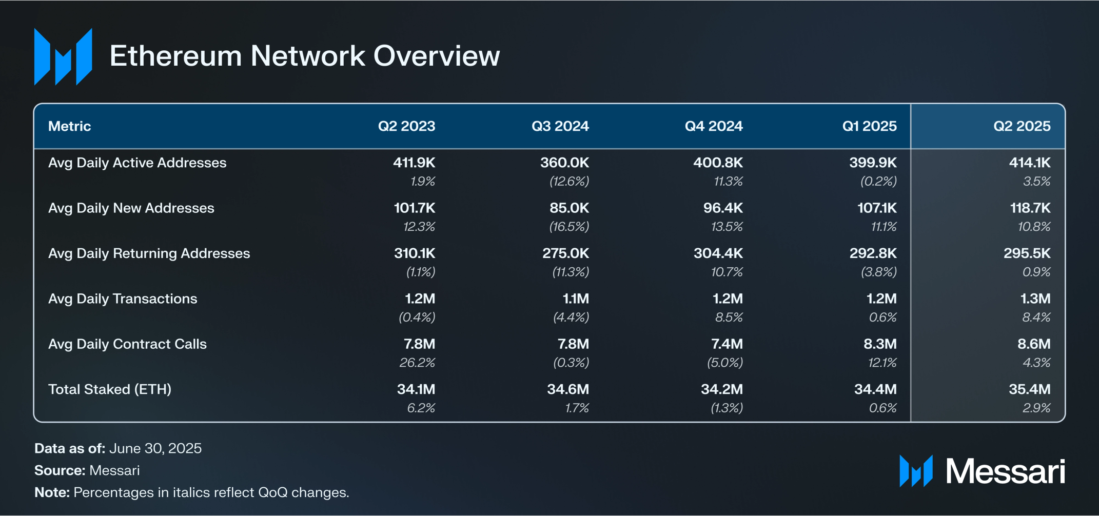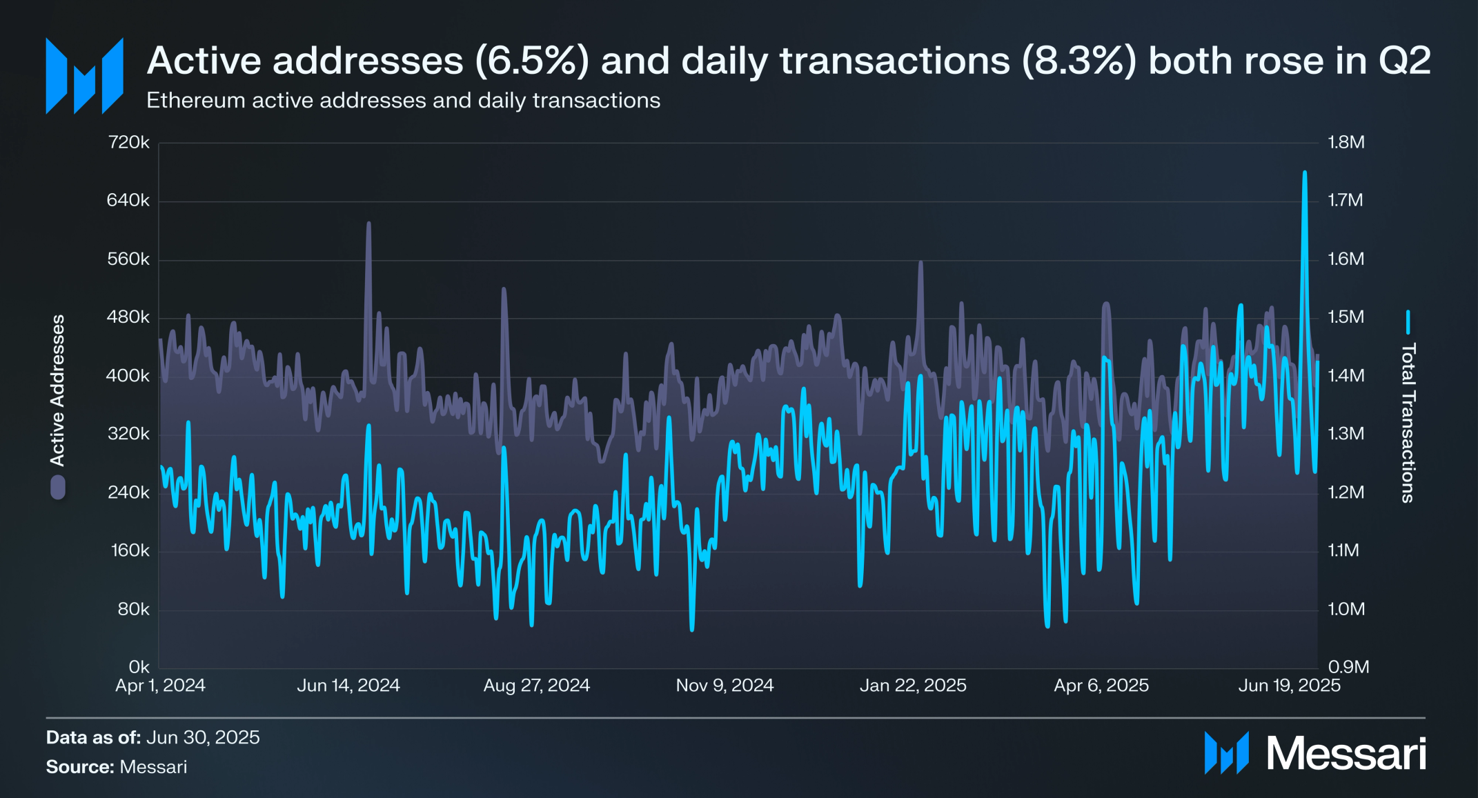 2025년 2월 이더리움 검증자들은 블록당 가스 한도를 3,000만에서 3,600만으로 늘리기로 투표했으며, 이는 2021년 8월 이후 첫 번째 증가였다. 가스 한도 증가는 이더리움의 트랜잭션 용량을 증가시킨다. 이러한 용량 증가의 결과로 2025년 2분기 이더리움의 온체인 활동이 소폭 증가했다. 일일 평균 트랜잭션은 1분기 말 132만에서 6월 30일까지 143만으로 전분기 대비 8% 증가했다. 이는 약 120만 수준에서 상대적으로 평탄한 트랜잭션 볼륨을 보인 4분기 이후 첫 번째 의미 있는 상승을 나타낸다.