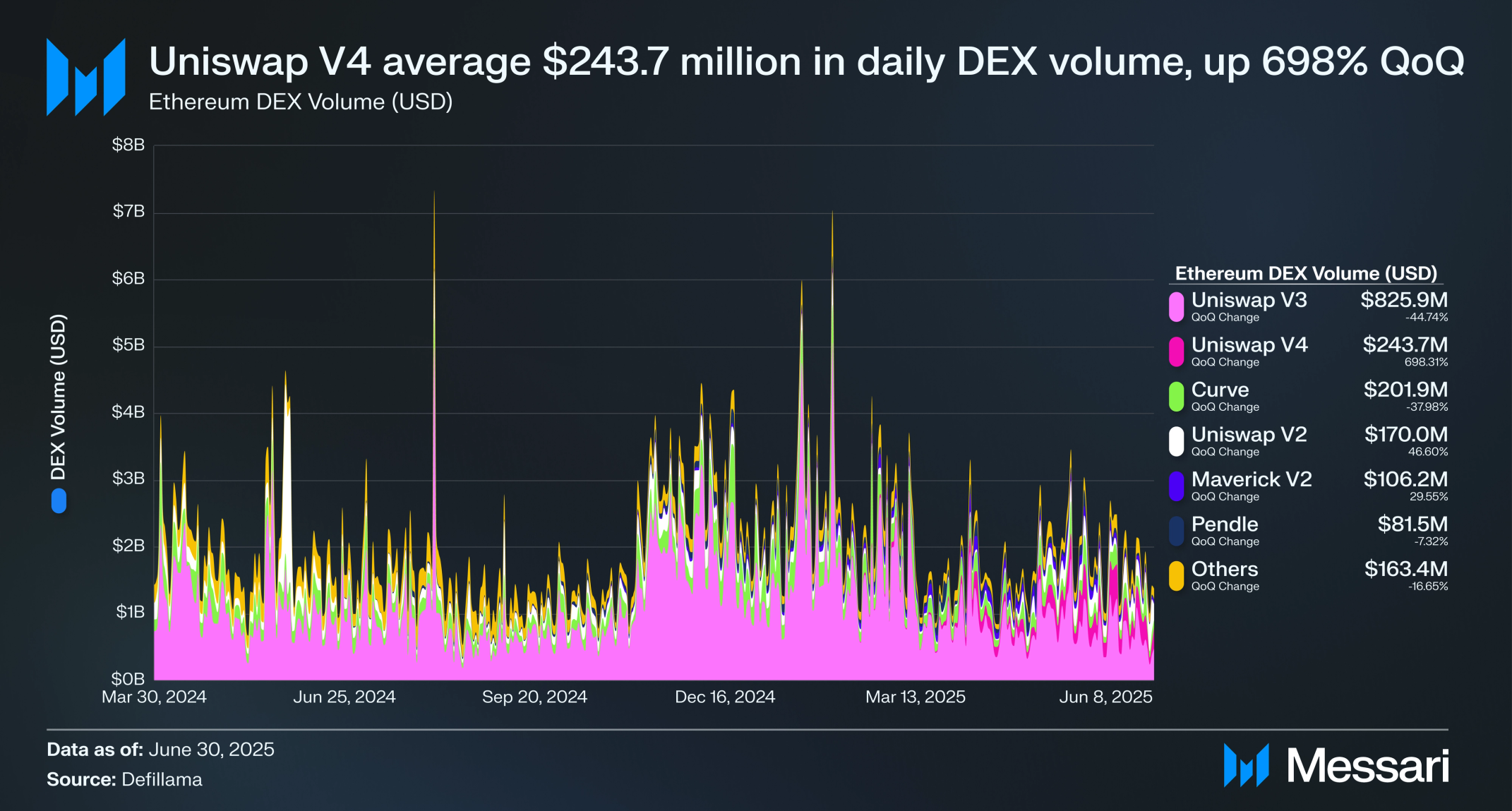 여전히 이더리움의 선도적인 DEX인 유니스왑 V3(Uniswap V3)은 활동에서 급격한 후퇴를 겪었다. 일일 평균 거래량이 전분기 대비 45% 감소하여 14억 9,000만 달러에서 8억 2,600만 달러로 떨어져 시장 점유율이 64%에서 46%로 줄어들었다. 한편 유니스왑 V4(Uniswap V4)는 큰 도약을 했다. 거래량이 단지 3,050만 달러에서 2억 4,370만 달러로 급증하여 시장 점유율이 1%에서 14%로 증가했으며, 더 많은 유동성과 사용량이 새로운 버전으로 이전했다.