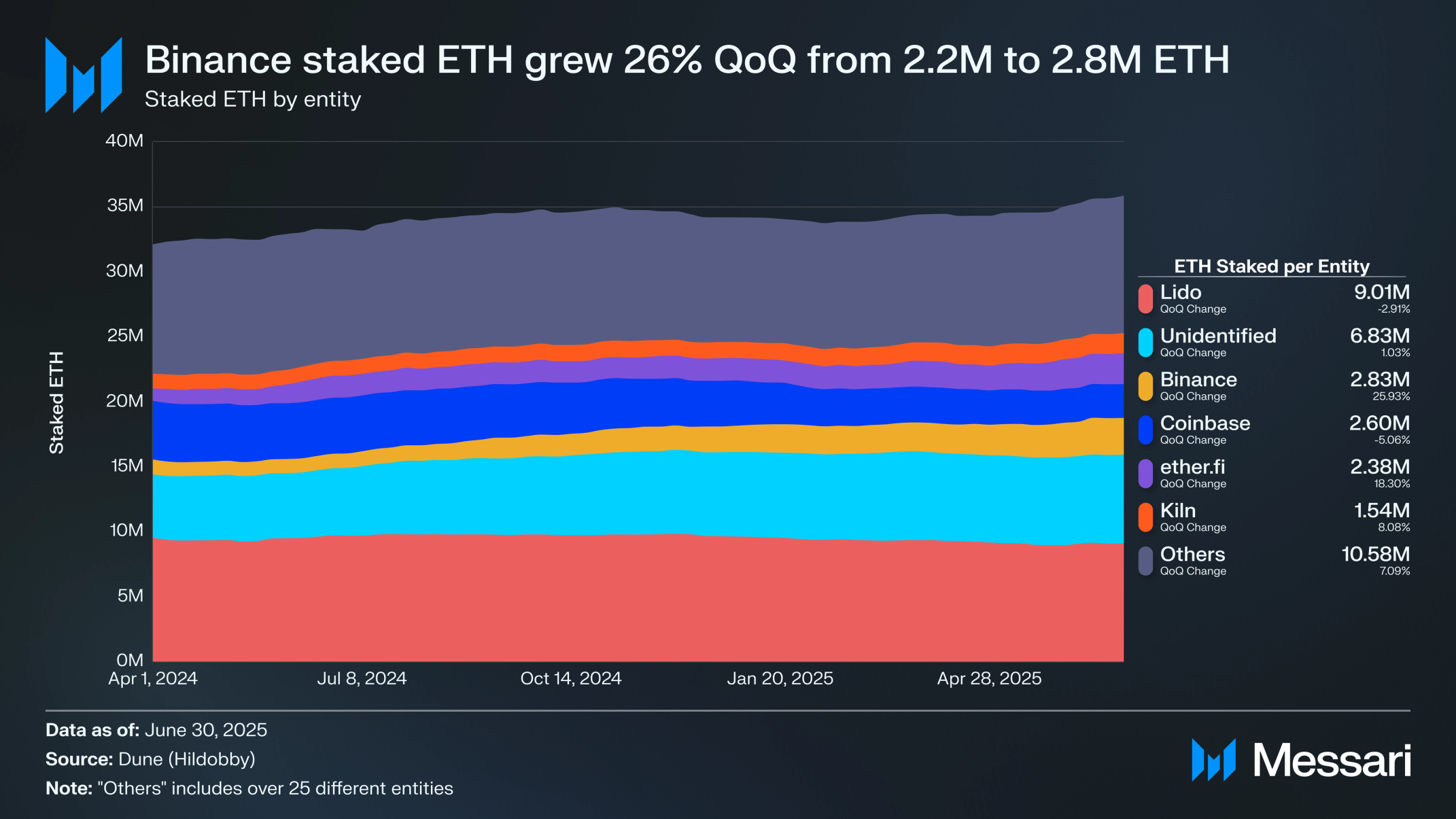 코인베이스의 하락세는 2분기까지 지속되어, 경쟁사들이 계속 견인력을 얻으면서 스테이킹된 ETH가 전분기 대비 5% 감소한 260만으로 떨어졌다. 이더파이는 전분기 대비 18% 증가한 240만 ETH 스테이킹을 넘어서며, 선도적인 리퀴드 리스테이킹 플랫폼으로서의 성장 추세를 계속했다. 킬른(Kiln)도 스테이킹된 ETH를 전분기 대비 8% 증가한 160만으로 늘렸다. 전반적으로 상위 6개 엔티티는 모든 스테이킹된 ETH의 약 93%를 차지했으며, "기타"의 롱테일은 분기 말까지 7% 증가한 1,060만 ETH를 기록했다.