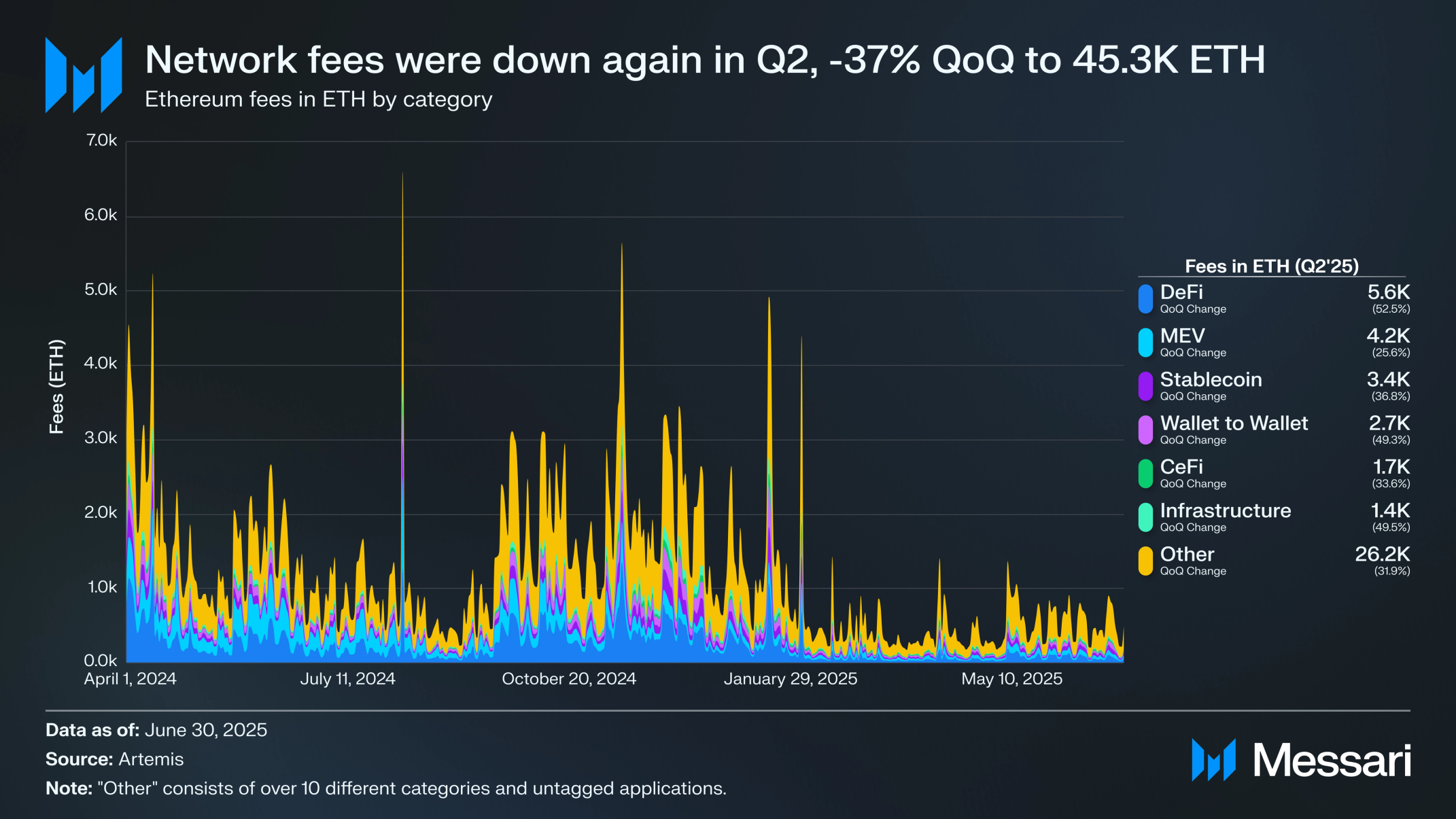 이더리움의 네트워크 수수료는 2021년 4분기 마지막 강세장에서 정점을 찍은 이후 장기적인 하락세를 보이고 있다. 2025년 2분기에 네트워크 수수료는 ETH와 USD 모두에서 다년간 최저치를 기록했다. ETH 기준 네트워크 수수료는 전분기 대비 37% 감소한 72,200에서 45,300으로 떨어졌고, USD 기준 네트워크 수수료는 전분기 대비 53% 감소한 2억 1,640만 달러에서 1억 230만 달러로 떨어졌다. 이러한 네트워크 수수료 감소의 주요 원인은 사용자 활동이 이더리움 L1에서 이더리움 L2로 이동하고 다른 L1들이 시장 점유율을 차지했기 때문이다. 트론(TRON, 1억 6,520만 달러)과 솔라나(Solana, 1억 2,120만 달러)는 2분기에 더 많은 네트워크 수수료를 기록한 유일한 L1들이었다. 또한 2분기에 수수료가 증가한 개별 카테고리는 없었다: