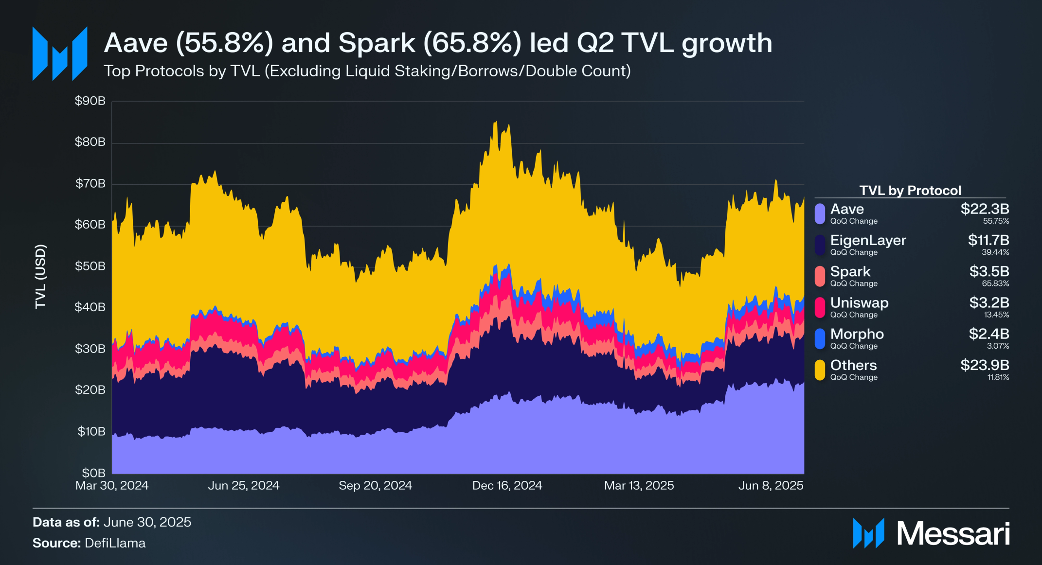 이더리움의 주요 디파이 프로토콜들은 시장 상황이 개선되면서 2025년 2분기에 강력한 회복을 보였다. 에이브(Aave)는 프로토콜 TVL에서 계속 지배적인 위치를 차지했으며, 전분기 대비 56% 증가한 143억 달러에서 223억 달러로 성장했다. 에이브의 성장은 이미 TVL 기준 가장 큰 디파이 프로토콜이라는 점에서 인상적일 뿐만 아니라, 시장 상황이 더 우호적으로 변하면서 대출과 차입에 대한 수요 증가를 보여준다. 스파크(Spark)도 2분기에 크게 성장하여 21억 달러에서 35억 달러로 전분기 대비 66% 증가했다. 아이겐레이어(EigenLayer)는 2분기 성장에서 동메달을 차지했으며, TVL이 전분기 대비 39% 증가한 84억 달러에서 117억 달러로 늘어났다. TVL 기준 가장 큰 프로토콜들이 2분기에 퍼센트 기준으로 가장 많이 성장했으며, 이는 기존 대형 디앱들이 갖고 있는 해자와 잘 정착된 플레이어가 되는 것과 함께 오는 신뢰를 보여준다.
