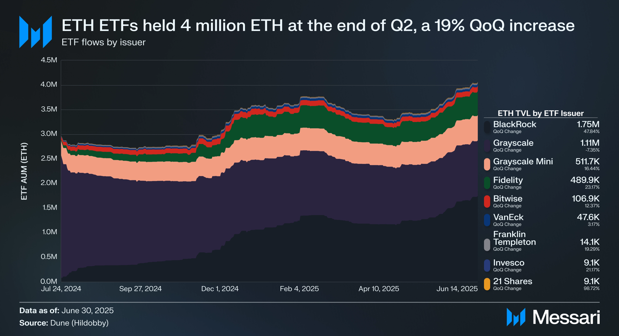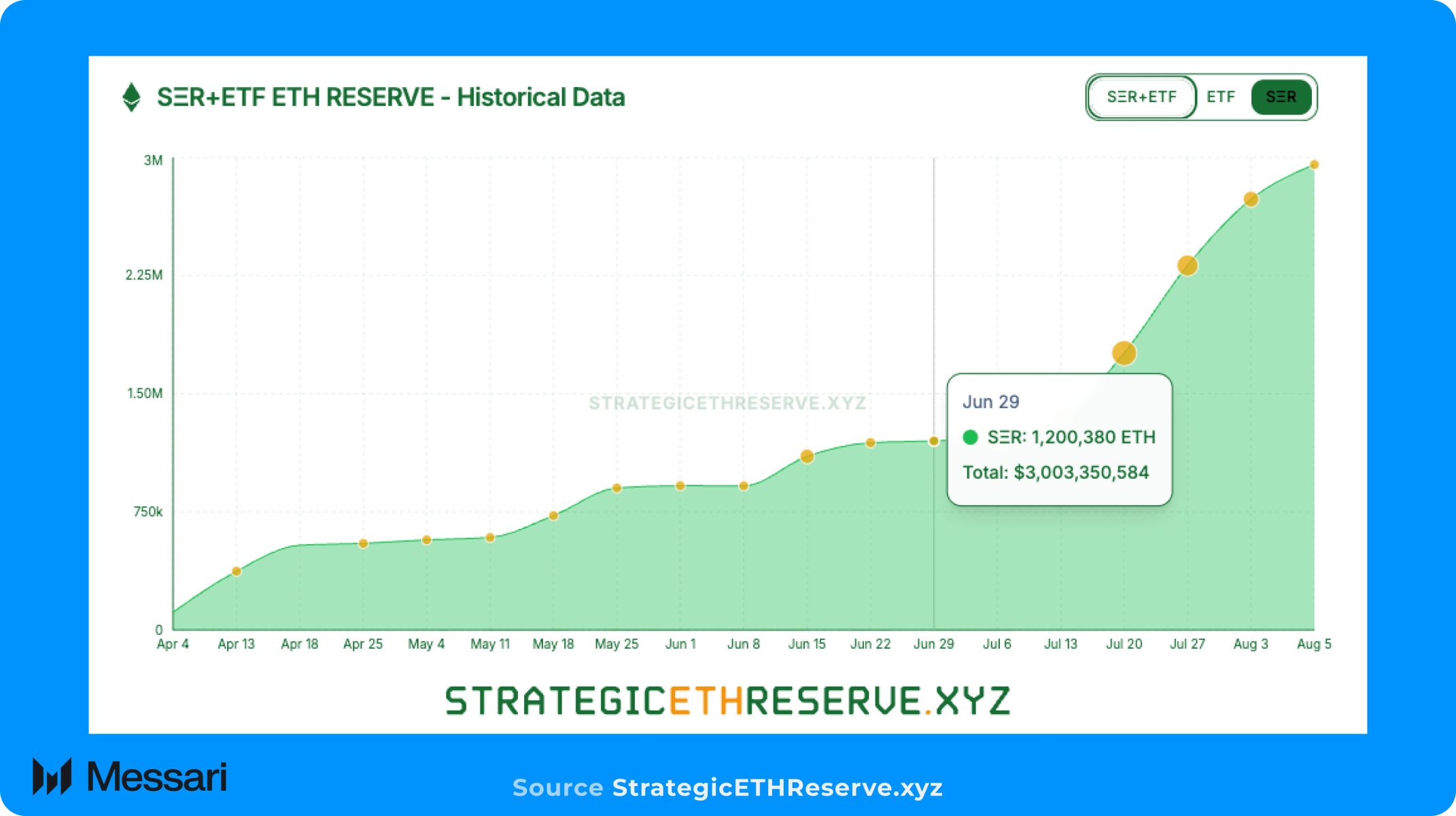 2025년 2분기에 여러 공개 거래 기업들이 기존 BTC 재무 전략을 반영한 이더리움 재무 전략을 공개했다. 이들은 총합적으로 분기 말까지 120만 ETH(30억 달러)를 축적하여 이더리움을 기업 대차대조표의 중심 자산으로 포지셔닝했다. 이러한 성장은 3분기로 가속화될 것으로 예상된다.