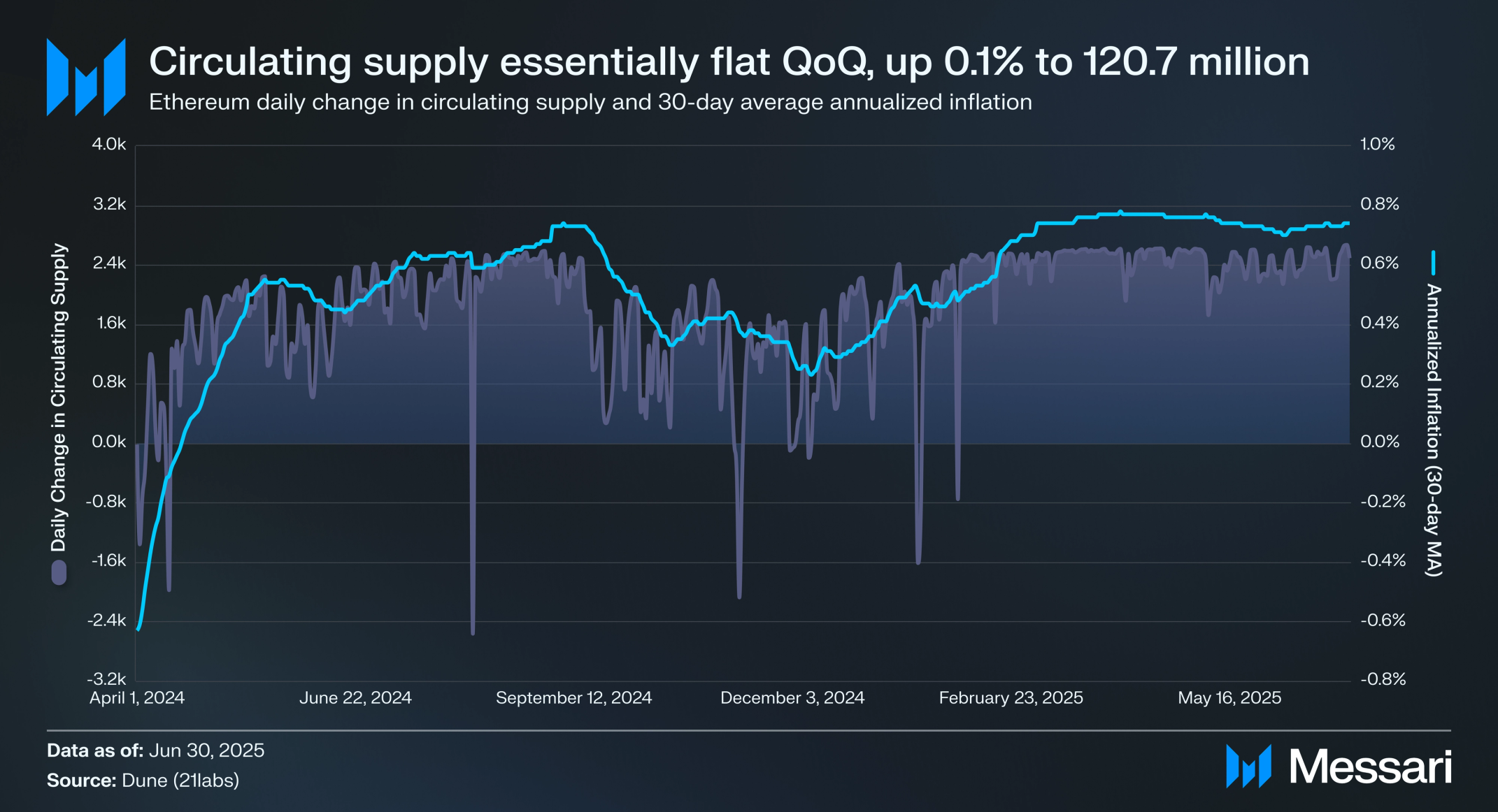 따라서 발행이 소각보다 클 때 이더리움의 유통 공급량은 인플레이션이다. 유통 공급량은 네트워크 사용량 감소로 인해 2024년 2분기부터 증가하고 있다. 2025년 2분기의 경우, 이더리움의 유통 공급량은 전분기 대비 0.1% 증가한 1억 2,070만 개를 기록했다. 또한 이더리움의 연환산 인플레이션율 30일 이동평균은 분기 말까지 0.7%(전분기 대비 4% 감소)를 기록했다.