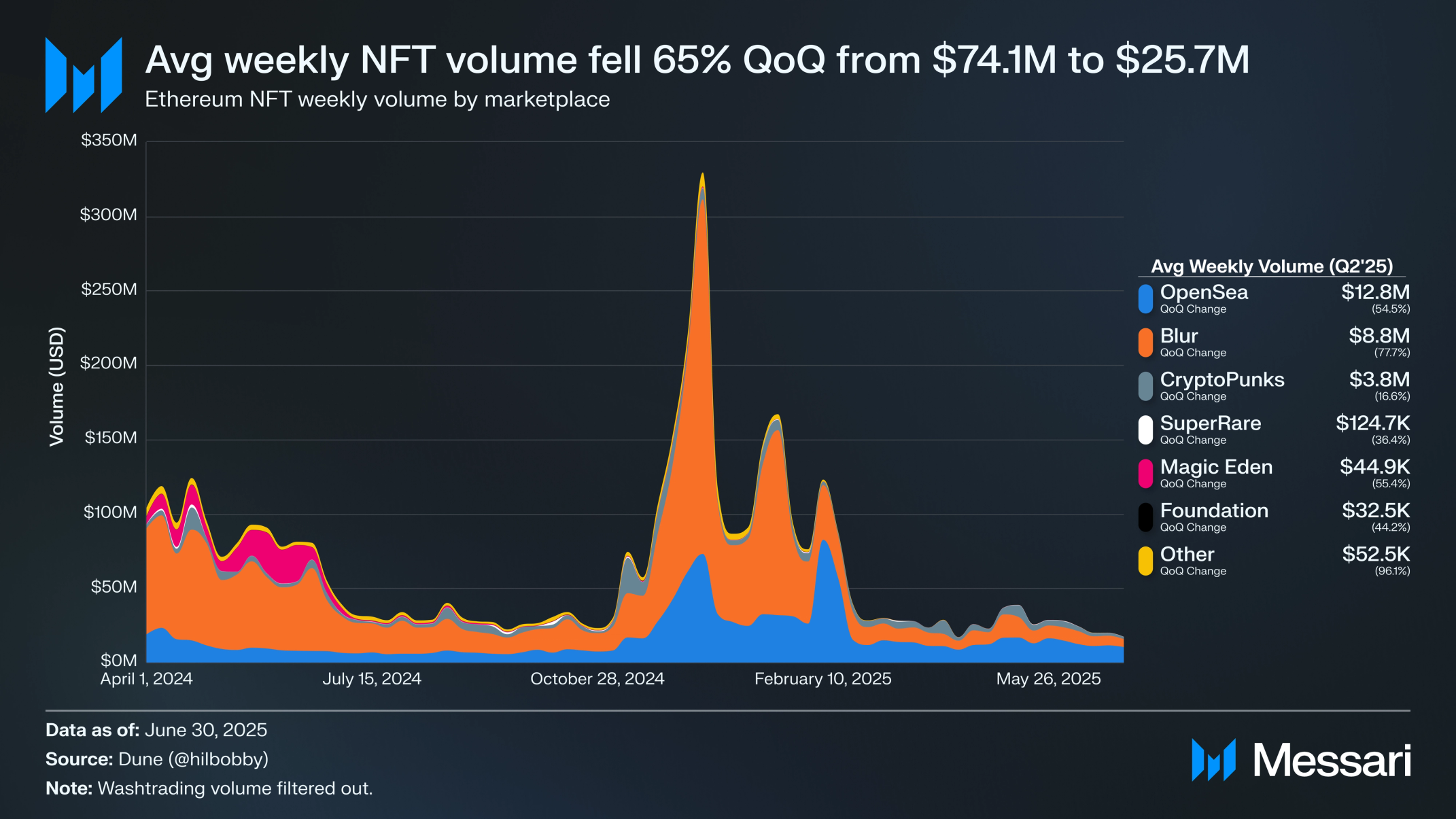 NFT 거래량은 2분기에 다년간 최저치를 기록했다. 퍼지 펭귄스(Pudgy Penguins)와 레밀리아(Remilia) 같은 NFT 프로젝트들의 토큰 출시로 인한 열기가 가라앉으면서, 주간 평균 NFT 거래량이 전분기 대비 65% 감소한 7,410만 달러에서 2,570만 달러로 떨어졌다.