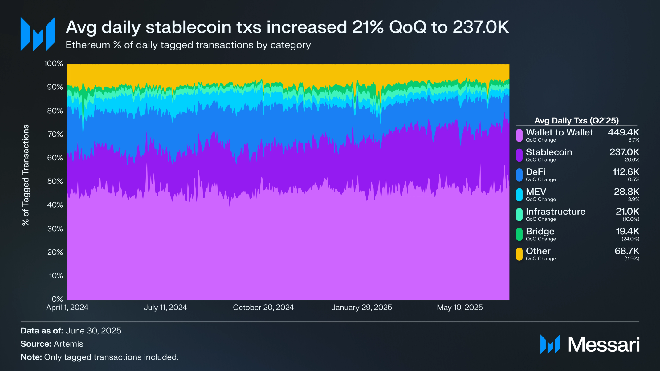 2분기 트랜잭션의 대부분은 지갑 간과 스테이블코인 두 카테고리에 의해 주도되었다. 지갑 간 트랜잭션은 역사적으로 이더리움에서 트랜잭션 활동의 주요 동력이었으며, 2분기도 예외가 아니었다. 이 카테고리의 일일 평균 트랜잭션은 전분기 대비 9% 증가한 449,400으로, 2분기 모든 태그된 트랜잭션의 48%를 차지했다. 스테이블코인 트랜잭션은 전분기 대비 가장 큰 증가를 기록했으며, 일일 평균이 21% 증가한 237,000(태그된 트랜잭션의 25%)을 기록했다. 지갑 간과 스테이블코인 트랜잭션을 합치면 2분기 모든 태그된 트랜잭션의 73%(70%에서 전분기 대비 5% 증가)를 차지했다. 반면 디파이(전분기 대비 1% 증가한 112,600)와 MEV(전분기 대비 4% 증가한 28,800) 관련 일일 평균 트랜잭션은 상대적으로 평탄했다.