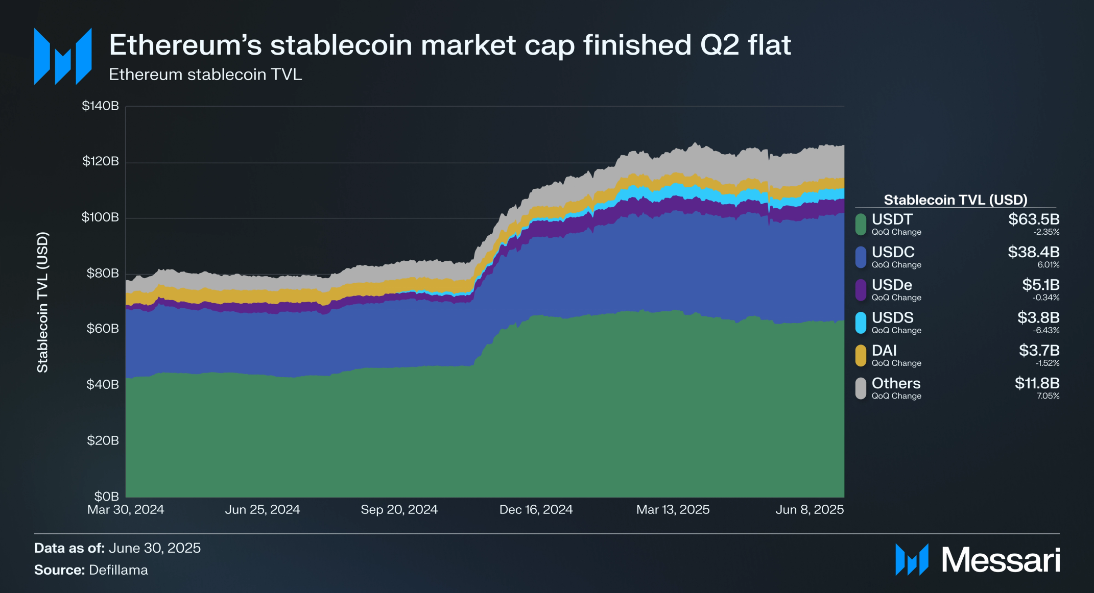 이더리움의 스테이블코인 성장은 2025년 2분기에 둔화되었지만 여전히 긍정적이었으며, 총 시가총액이 3월 말 1,251억 3,000만 달러에서 6월 30일까지 1,262억 3,000만 달러로 전분기 대비 1% 증가했다. 이는 이더리움 기반 스테이블코인의 7분기 연속 성장을 나타냈다.