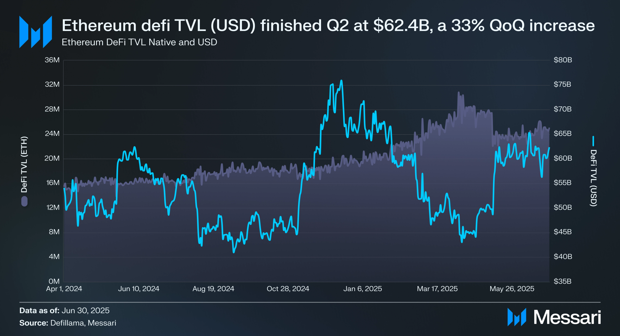 이더리움 디파이 TVL은 2025년 2분기에 반등했으며, USD 기준 총 예치 가치가 469억 달러에서 624억 달러로 전분기 대비 33% 증가하여 1분기 하락분의 대부분을 회복했다. 이더리움은 TVL 기준 지배적인 디파이 체인으로서의 선두 지위를 유지했으며, 52%에서 2분기 말까지 56%로 성장했다. ETH 기준으로는 디파이 TVL이 2,570만에서 2,510만 ETH로 3% 감소했다.