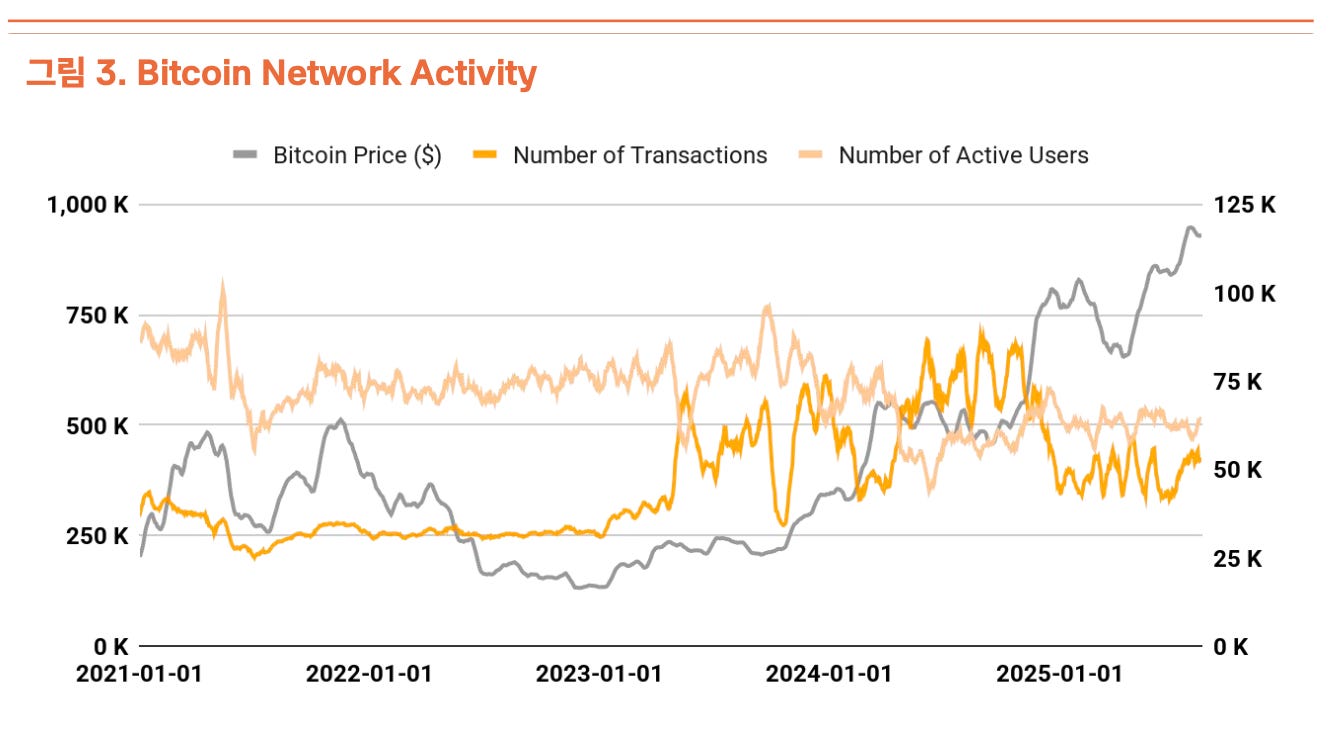 다만 펀더멘털 측면에서 균형적인 성장은 보이지 않고 있다. 기관 중심의 재편은 비트코인 네트워크 가치의 상승을 견인한 것은 분명하나, 거래 건수와 활성 사용자 수는 여전히 회복되지 못하고 있기 때문이다(그림 3).