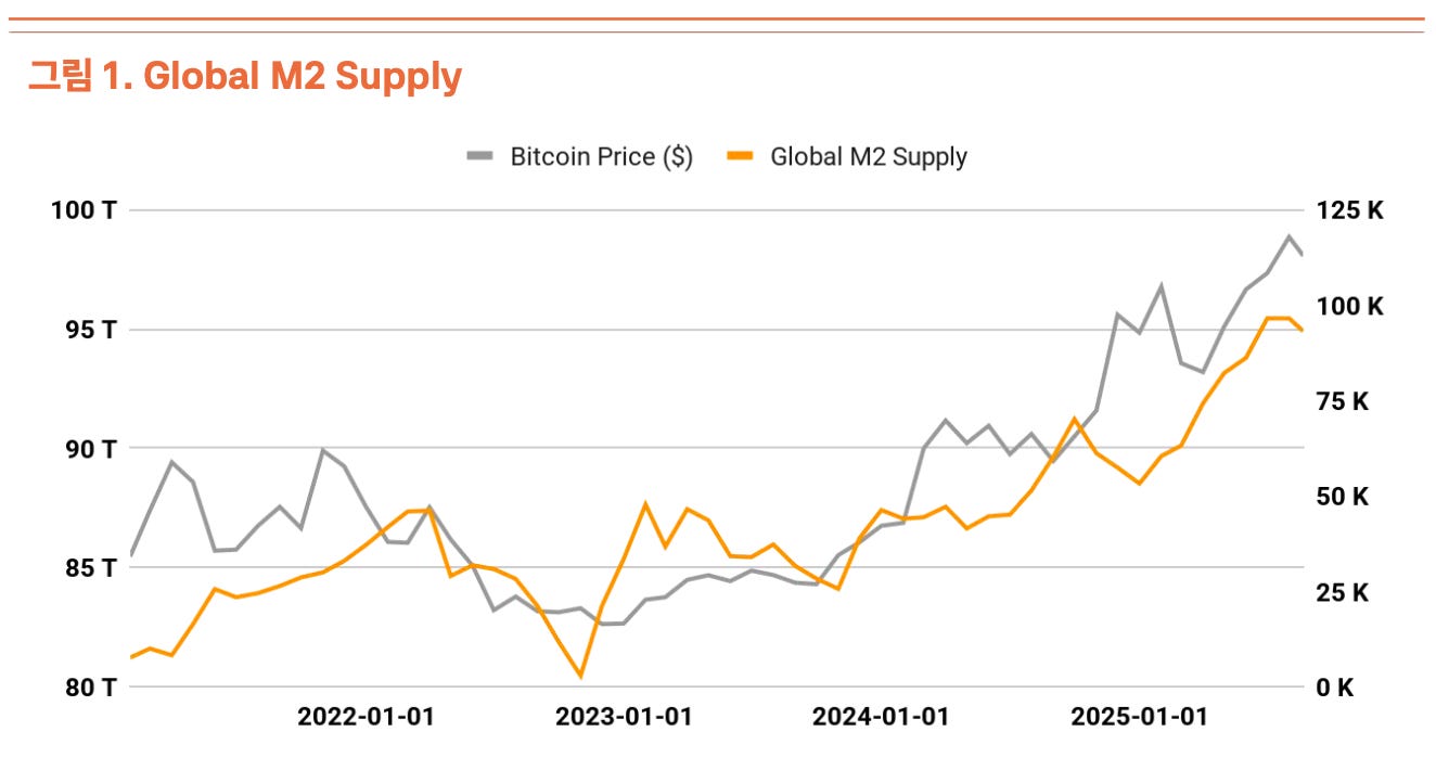 글로벌 유동성 측면에서 주목할 것은 주요국 M2 통화공급량이 90조달러를 돌파하여 사상 최고치를 경신하고 있다는 점이다. 역사적으로 M2 증가율과 비트코인 가격은 유사한 방향성을 보여왔는데, 현재의 통화 확대 기조가 유지된다면 추가 상승 여력이 충분하다(그림 1).