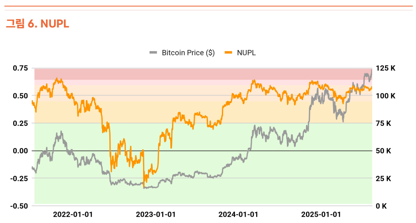 하지만 투자자들의 실현 손익을 보여주는 aSOPR(1.019)과 전체 시장의 미실현 손익을 나타내는 NUPL(0.558)은 여전히 안정 구간에 머물러 있어 시장이 아직 건전하다는 신호를 보낸다(그림 5, 6).