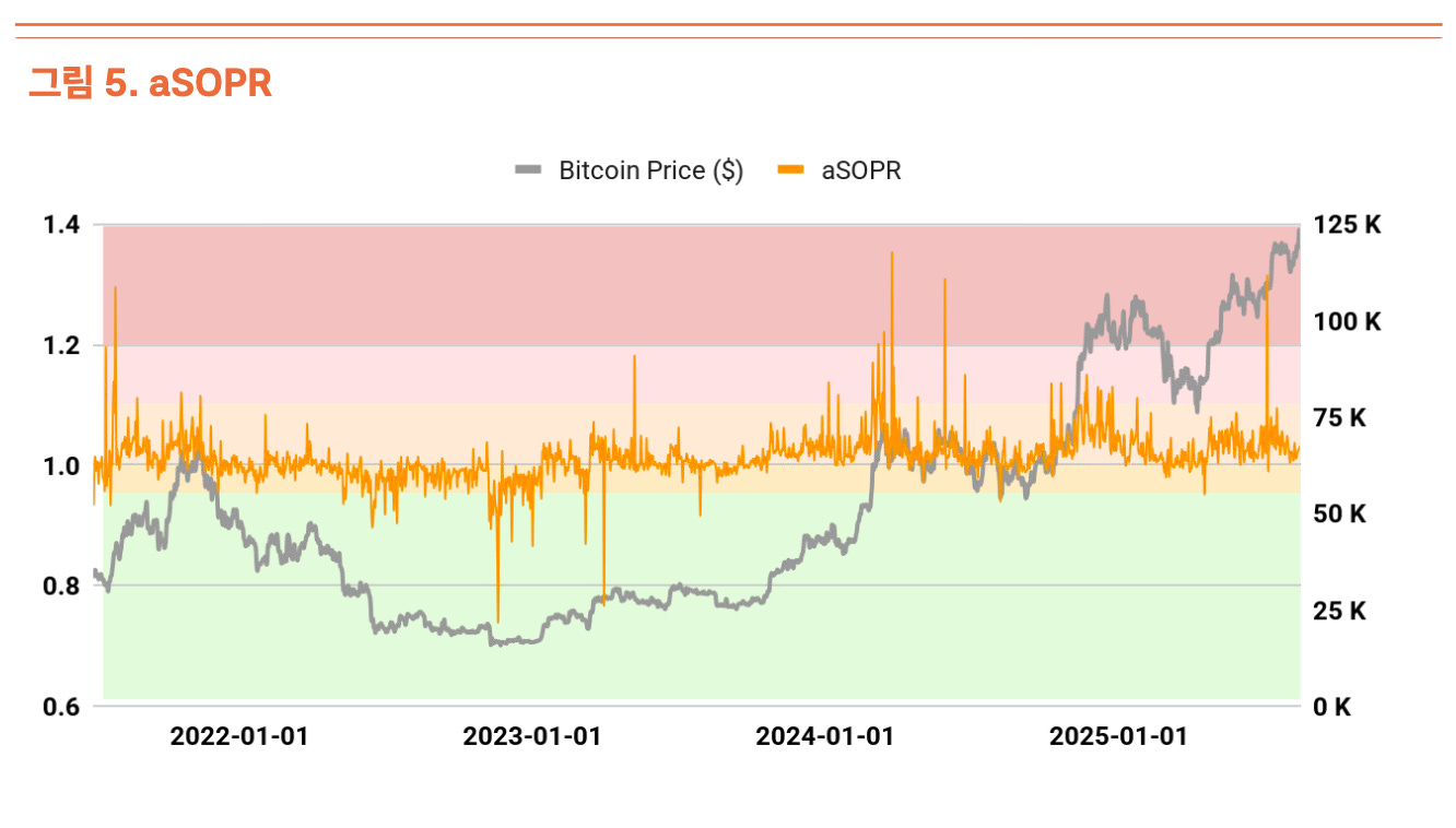 쉽게 말해, 현재 가격은 평균 매수가 대비 높지만(MVRV-Z), 실제 매도하는 투자자의 수익률은 높지 않으며(aSOPR), 시장 전체적으로도 과도한 수익 상태는 아니라는 의미다(NUPL).