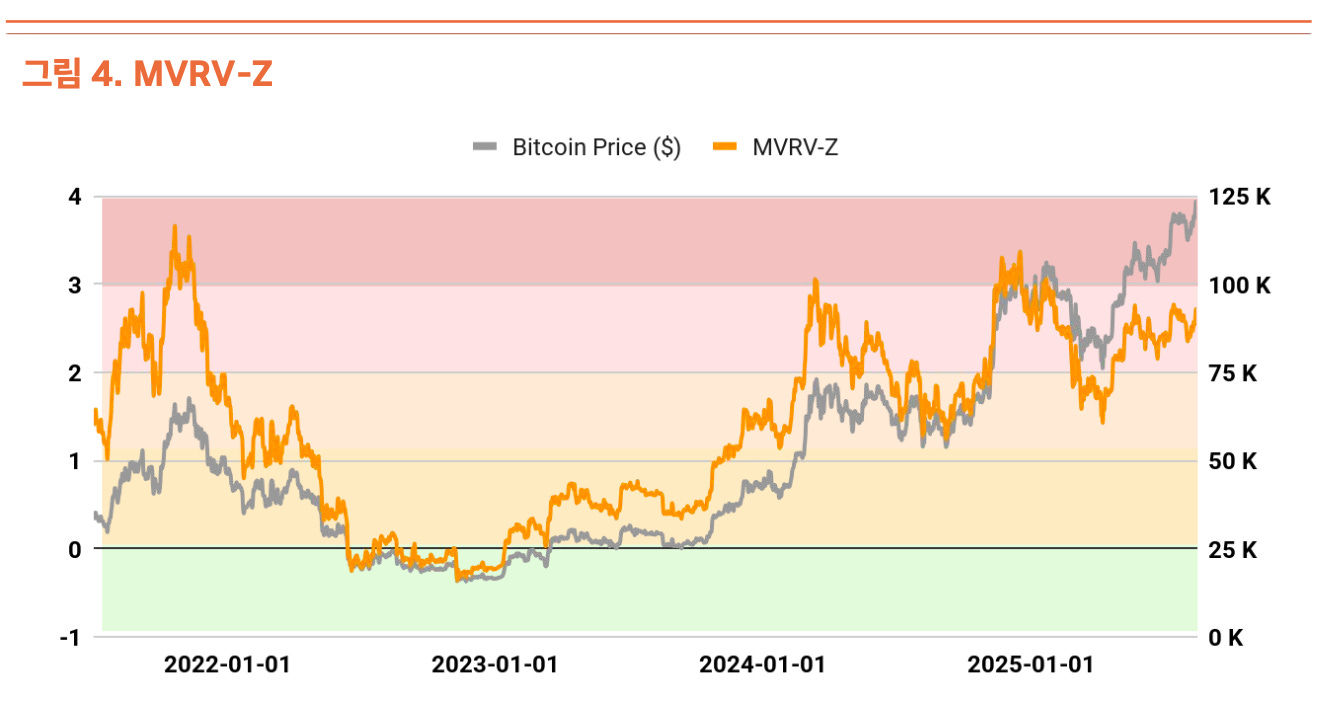 온체인 지표의 기술적 분석에 의하면 일부 과열 신호가 있지만 여전히 시장의 과도한 급락 가능성은 제한적으로 보인다. 현재 가격이 투자자들의 평균 매수가 대비 얼마나 높은지를 보여주는 MVRV-Z 지표는 2.49로 과열 구간에 진입했고, 최근 2.7까지 치솟으며 단기 조정 가능성을 경고하고 있다(그림 4).