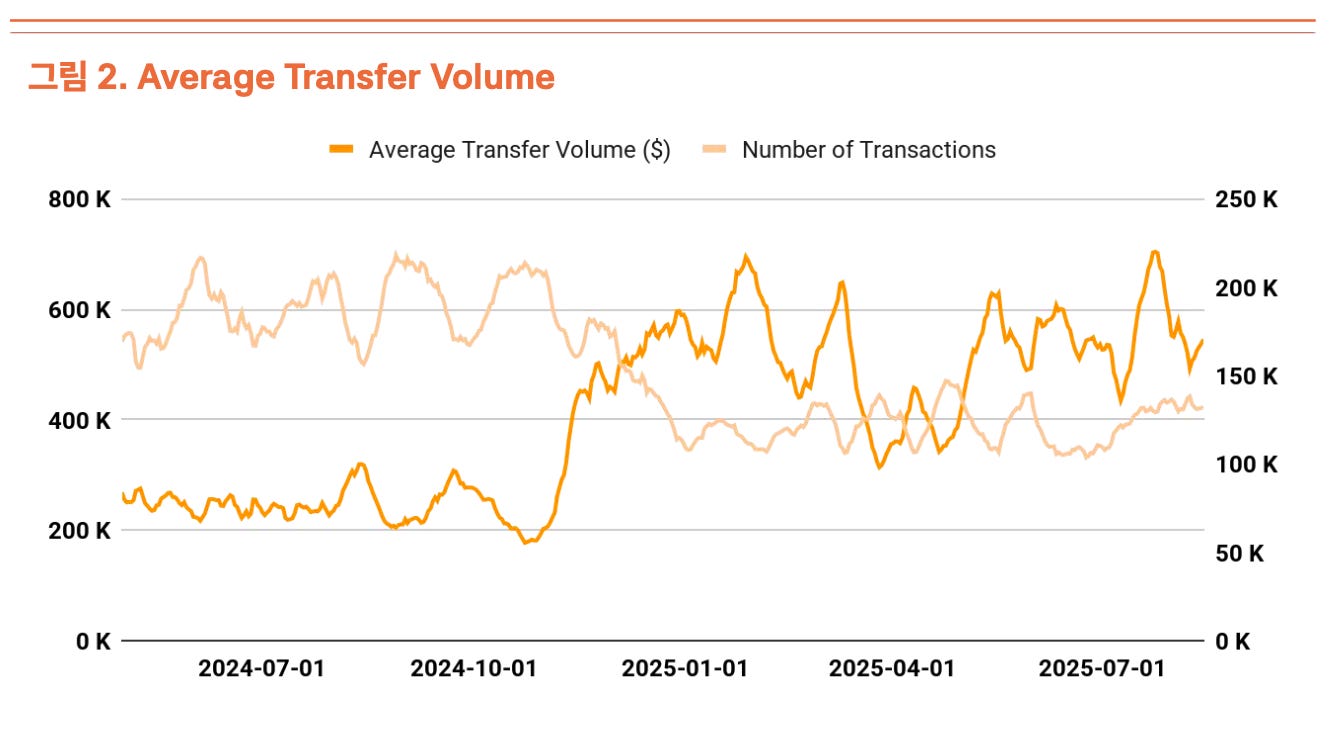 현재 비트코인 네트워크는 대형 투자자를 중심으로 재편되고 있다. 일일 평균 거래 건수는 2024년 10월 66만개에서 2025년 3월 38만개로 41% 급감했지만, 단위당 비트코인 전송량은 오히려 증가했다. 스트래티지 같은 기관들의 고액 거래가 늘어나면서 건당 평균 거래규모가 커진 것이다. 이는 비트코인 네트워크가 '소액 다빈도' 거래에서 '대규모 저빈도' 거래 체제로 전환되었음을 의미한다(그림 2).