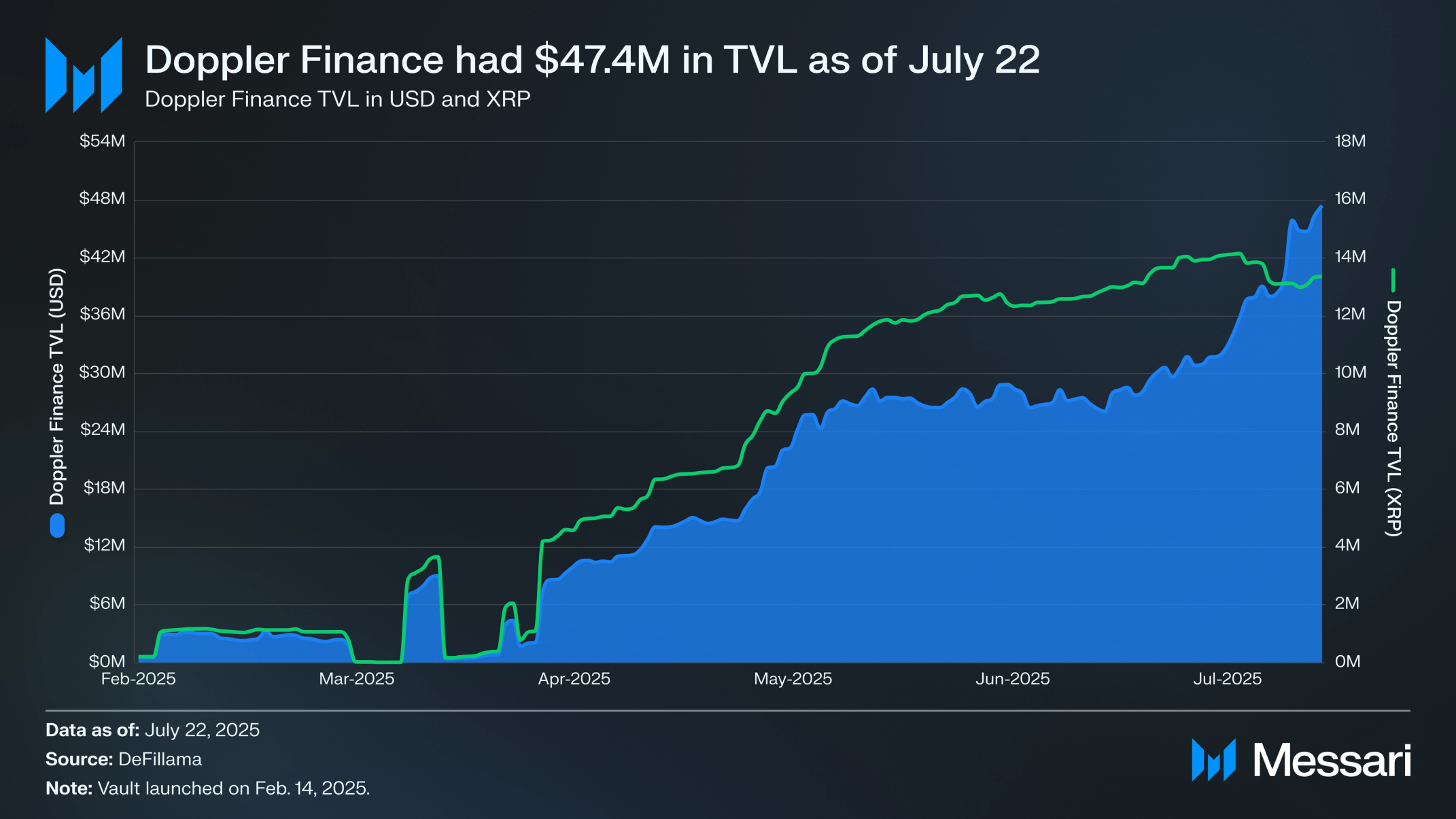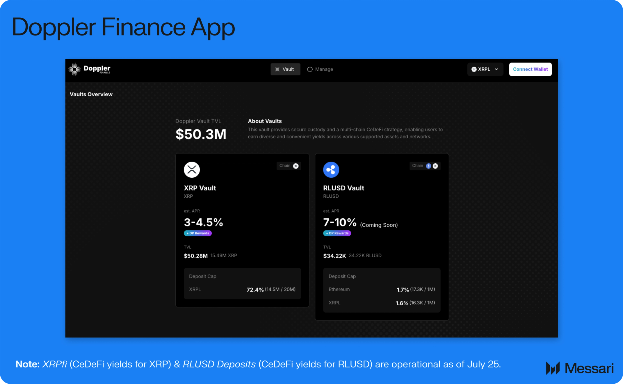 도플러 파이낸스는 중앙화 보관과 오프체인 실행을 수익 창출 전략에 결합하는 하이브리드 접근법인 CeDeFi 모델을 통해 현재 XRP의 제한된 온체인 유용성을 해결하는 수익 창출 프로토콜이다. 도플러는 2월 14일 XRPfi 상품을 출시하여 증가하는 사용자 수요를 끌어들였고 7월 22일 기준 4천740만 달러의 TVL에 도달했다. 유입을 관리하고 위험 노출을 제한하기 위해, 도플러는 배치당 허용되는 XRP 예치 금액을 제한하는 배치 기반 예치 시스템을 사용한다. XRP 볼트의 초기 배치들은 몇 분 내에 채워졌고, 이후 배치들은 규모가 확대되었으며, 5월 15일 출시된 배치 5는 7월 22일에 2천만 XRP 용량의 67% 이상에 도달했다. 2025년 3분기, 도플러는 또한 XRPL이나 이더리움에서 예치를 받는 RLUSD 볼트를 출시했으며, 수익 전략은 2025년 3분기에 활성화될 예정이다. 통합 파트너인 파이어블록스, 세프, 비트고가 기관급 보관을 제공하고, 250만 달러 프리시드 라운드가 팀이 초기 CeDeFi 제공을 넘어서 구축할 수 있도록 했다.