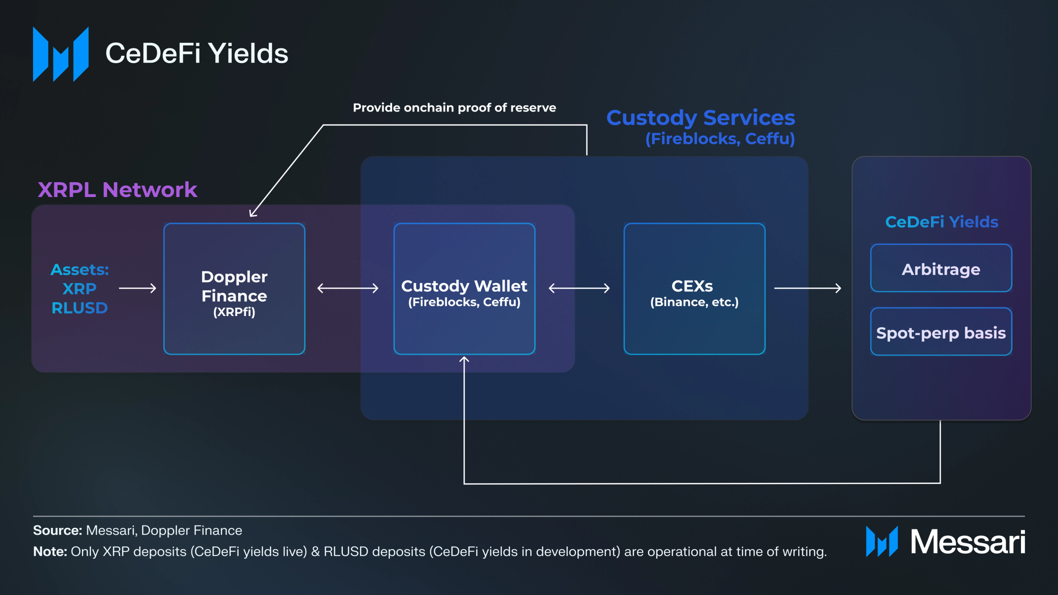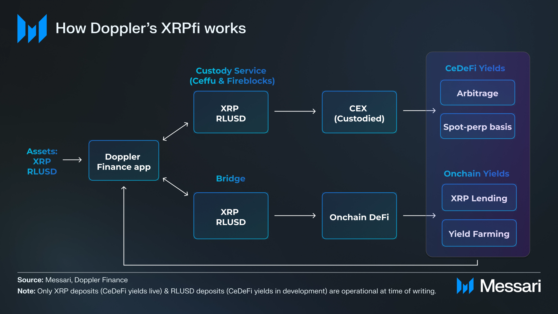 도플러 파이낸스는 2025년 2월에 출시되었으며, 첫 번째 XRP 수익 상품인 XRPfi는 빠르게 견인력을 얻어 2025년 7월까지 5천만 달러의 TVL에 도달했다. 이 상품은 수익 창출을 위한 중앙화 보관과 오프체인 실행을 결합하는 중앙화 탈중앙화 금융(CeDeFi) 모델을 사용한다. CeDeFi는 전통적인 금융 감독과 블록체인 기반 금융 서비스 간의 균형을 추구하는 사용자를 대상으로 한다.