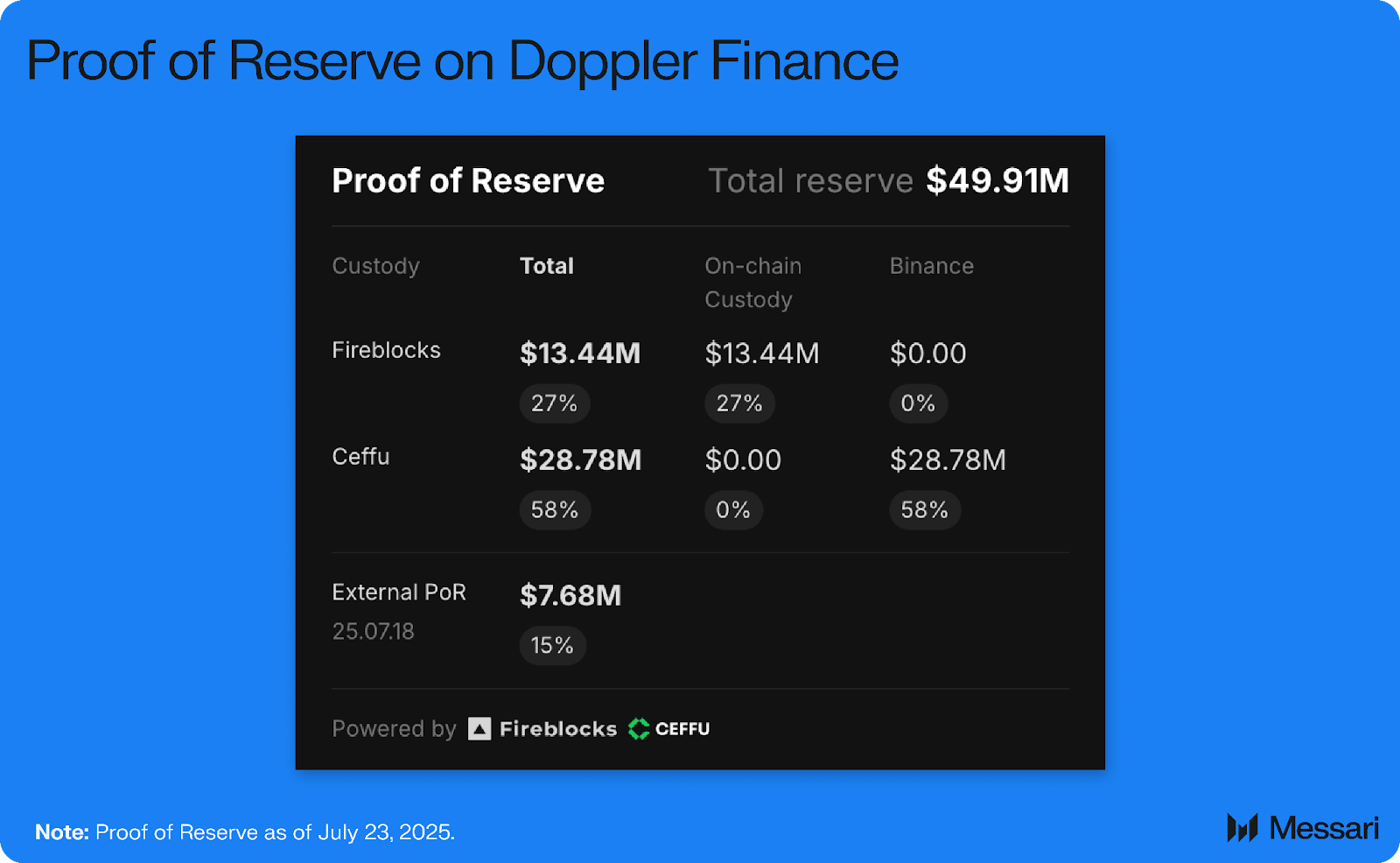 • 보관은 파이어블록스(Fireblocks)와 세프(Ceffu)가 담당하며, 이들은 도플러의 오프체인 차익거래 전략을 위해 사용자 예치금을 관리한다. 현재 이러한 전략은 바이낸스(Binance)에서만 실행되지만, 더 많은 거래소 파트너가 추가될 예정이다. 비트고(BitGo)는 5월 26일 도플러와 제3의 보관업체로 파트너십을 맺었지만, 보관 통합은 아직 활성화되지 않았다.