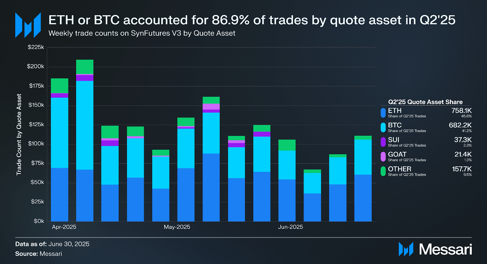2분기에 ETH와 BTC는 신퓨처스에서 견적 자산별 총 160만 거래 중 86.9% 시장 점유율을 차지했다. ETH는 지난 4분기 동안 BTC가 가장 많이 거래된 자산이었던 후 2분기에 가장 많이 거래된 자산이 되었으며, 75만8천100건의 거래(45.8% 점유율)를 기록했고, BTC가 68만2천200건의 거래(41.2% 점유율)로 그 뒤를 따랐다. SUI(수이 L1 블록체인 토큰)가 3만7천300건의 거래(2.3% 점유율)로 3위, GOAT(솔라나 기반 밈코인)가 2만1천400건의 거래(1.3% 점유율)로 4위를 차지했다. 상위 4개 외에 거래된 자산은 15만7천700건의 거래(9.5% 점유율)를 차지했으며, ME(매직 에덴 토큰), MEW(솔라나 기반 밈코인), MOVE(무브먼트 랩스 L2 블록체인 토큰), PENGU(퍼지 펭귄 토큰)가 주도했다.