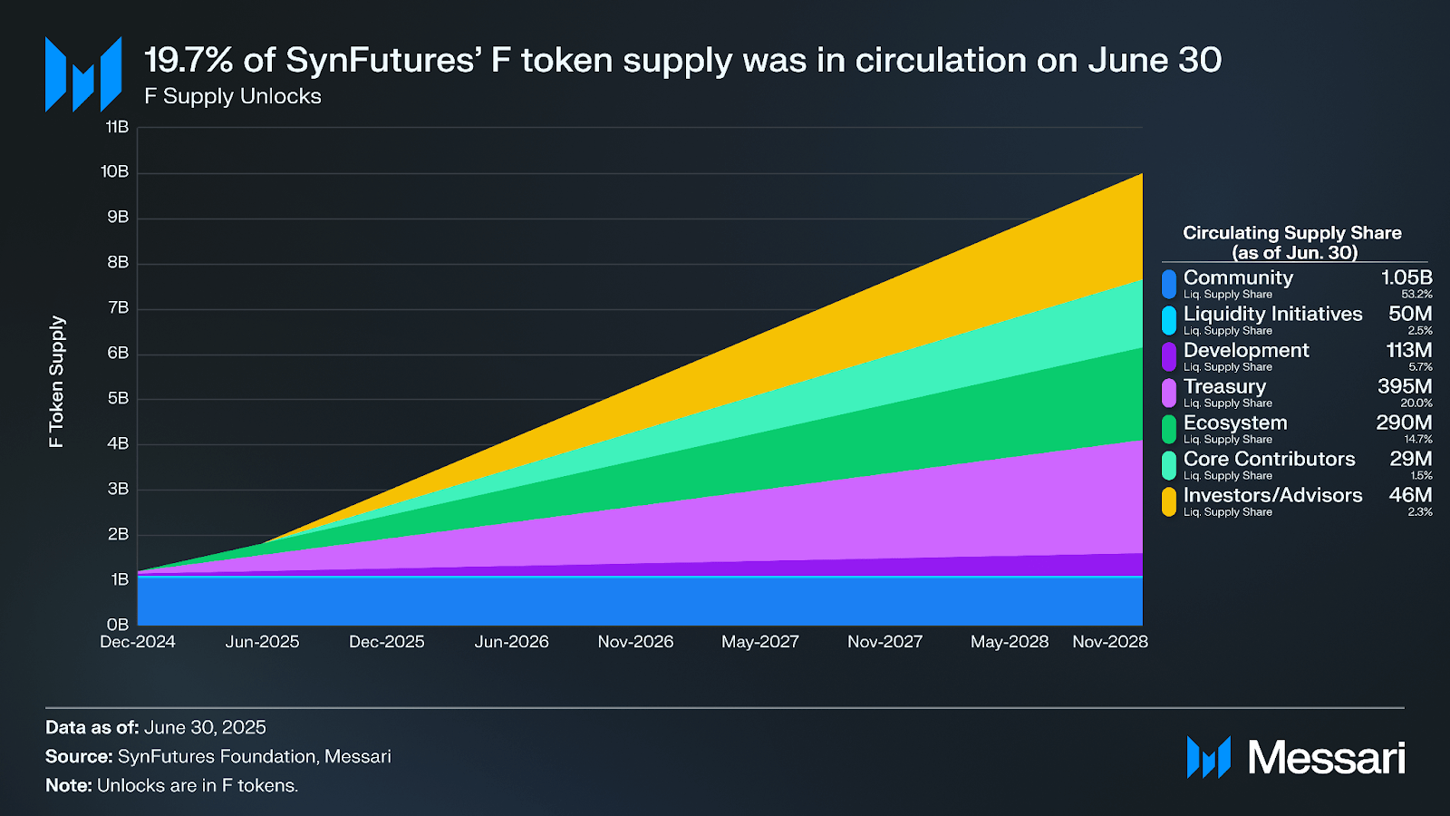 6월 30일 기준, 신퓨처스의 베스팅 일정에 따르면 19억7천만 개의 F 토큰(총 공급량의 19.7%)이 유통되어 3월 31일 15억9천만 개(총 공급량의 15.9%)에서 증가했다. 신퓨처스는 2분기 동안 3억8천340만 개의 F 토큰(총 공급량의 3.83%)을 언락했다. 6월 6일은 핵심 기여자 배정(15% 또는 15억 토큰)과 투자자 및 고문 배정(23.5% 또는 23억5천만 토큰)의 6개월 클리프 종료를 표시했다. 이 이벤트는 두 그룹 모두에 대한 선형 언락 일정을 촉발했으며, 토큰은 2028년 12월 6일까지 향후 3.5년에 걸쳐 계속 선형적으로 언락된다. 앞으로 모든 나머지 F 토큰 배정은 2028년 12월 6일 완전히 베스팅될 때까지 계속 선형적으로 언락된다.