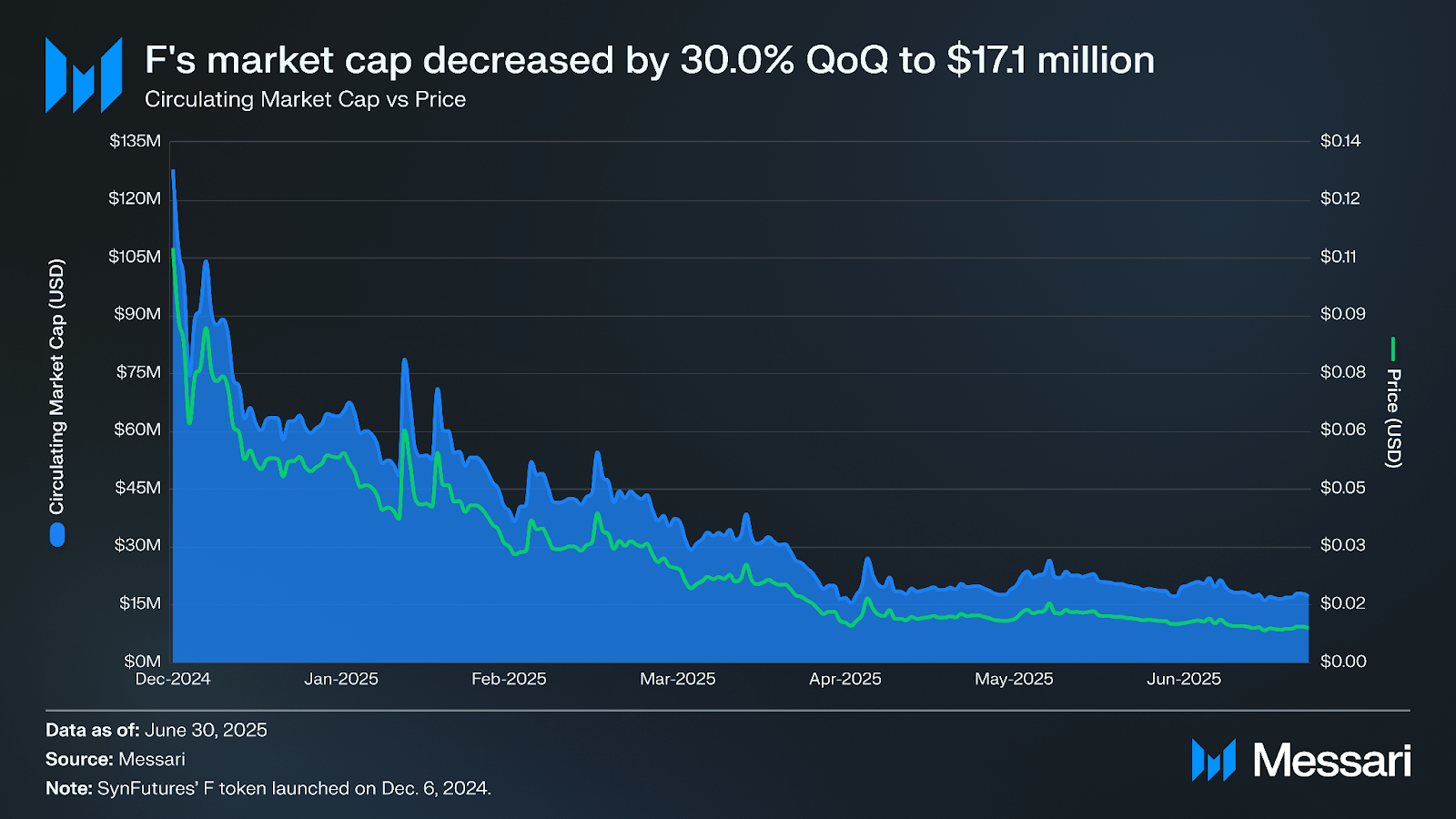 신퓨처스의 시가총액은 3월 31일 2천440만 달러에서 6월 30일 1천710만 달러로 전분기 대비 30.0% 감소했다. F 토큰 가격은 같은 기간 동안 전분기 대비 44.8% (0.007달러) 하락하여 0.016달러에서 0.009달러로 감소했다. 2024년 12월 6일 출시된 F 토큰은 생애주기에서 상대적으로 초기 단계에 있으며, 시장이 적절한 가치평가를 결정하면서 새로운 토큰은 종종 가격 변동성을 경험한다. 신퓨처스가 베이스에서 확장하고, 실물 자산 시장을 도입하며, 빌더 프로그램을 통해 F 토큰 유용성을 증가시키면서, 이러한 이니셔티브는 시간이 지남에 따라 보다 지속 가능한 사용과 가치평가를 지원할 수 있다.