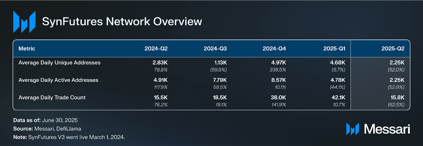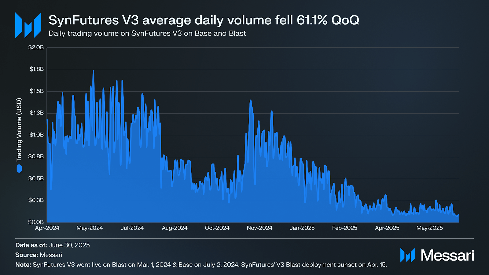 신퓨처스의 평균 일일 거래량은 전분기 대비 61.1% 감소하여 3억7천910만 달러에서 1억4천740만 달러로 줄었다. 4월 11일, 신퓨처스는 이더리움 L2 블록체인인 블래스트에서 프로토콜의 폐기를 발표하여 4월 15일 08:00 UTC부터 효력을 발휘했다. 2분기 거래량은 같은 날 3억1천400만 달러로 정점을 찍었으며, 이는 4월 15일 종료 전에 블래스트에서 자금을 이동하는 것과 관련된 사용자 활동을 반영할 가능성이 높다. 4월 15일부터 6월 30일까지 신퓨처스의 평균 일일 거래량은 1억3천330만 달러였다.