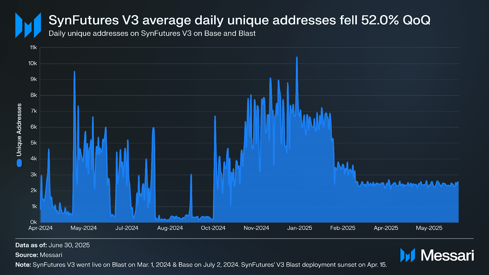 • 신퓨처스는 베이스에 자원을 집중하기 위해 4월 15일 블래스트(Blast) 배포를 중단했다. 이러한 전환 기간의 결과로, 프로토콜은 2025년 2분기에 134억 달러의 무기한 선물 거래량을 처리하여 전분기 대비 61.1% (204억 달러) 감소했다.