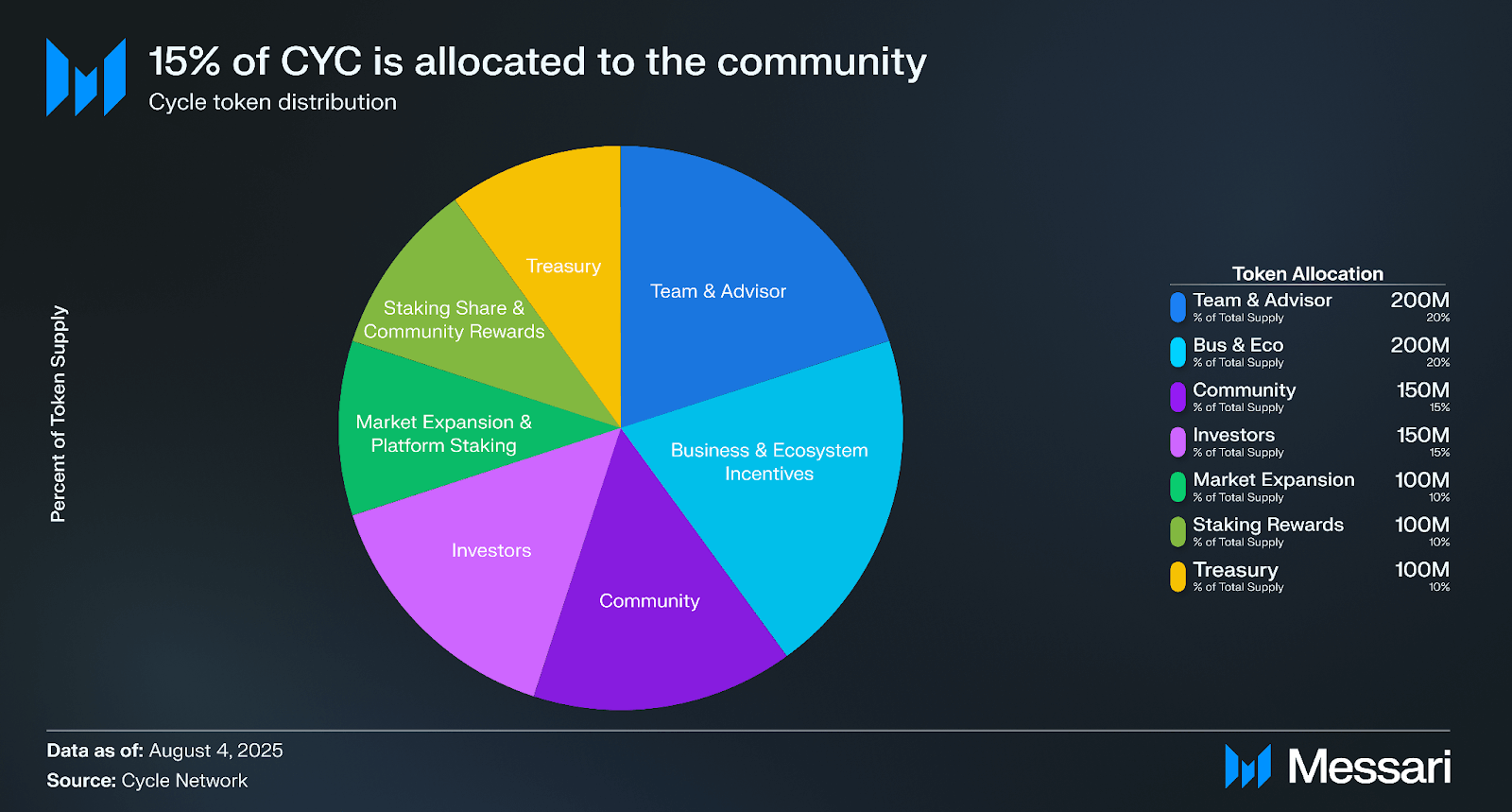 사이클 네트워크의 토크노믹스 모델은 네트워크의 유틸리티 및 거버넌스 토큰 역할을 할 고정 공급 토큰인 CYC를 중심으로 구축된다. 총 공급량은 10억 CYC이며, 프로토콜은 더 이상 토큰을 발행하지 않겠다고 약속했다. CYC의 공급량은 프로젝트 개발과 커뮤니티 및 참가자의 인센티브를 모두 보장하기 위해 여러 카테고리에 할당된다: