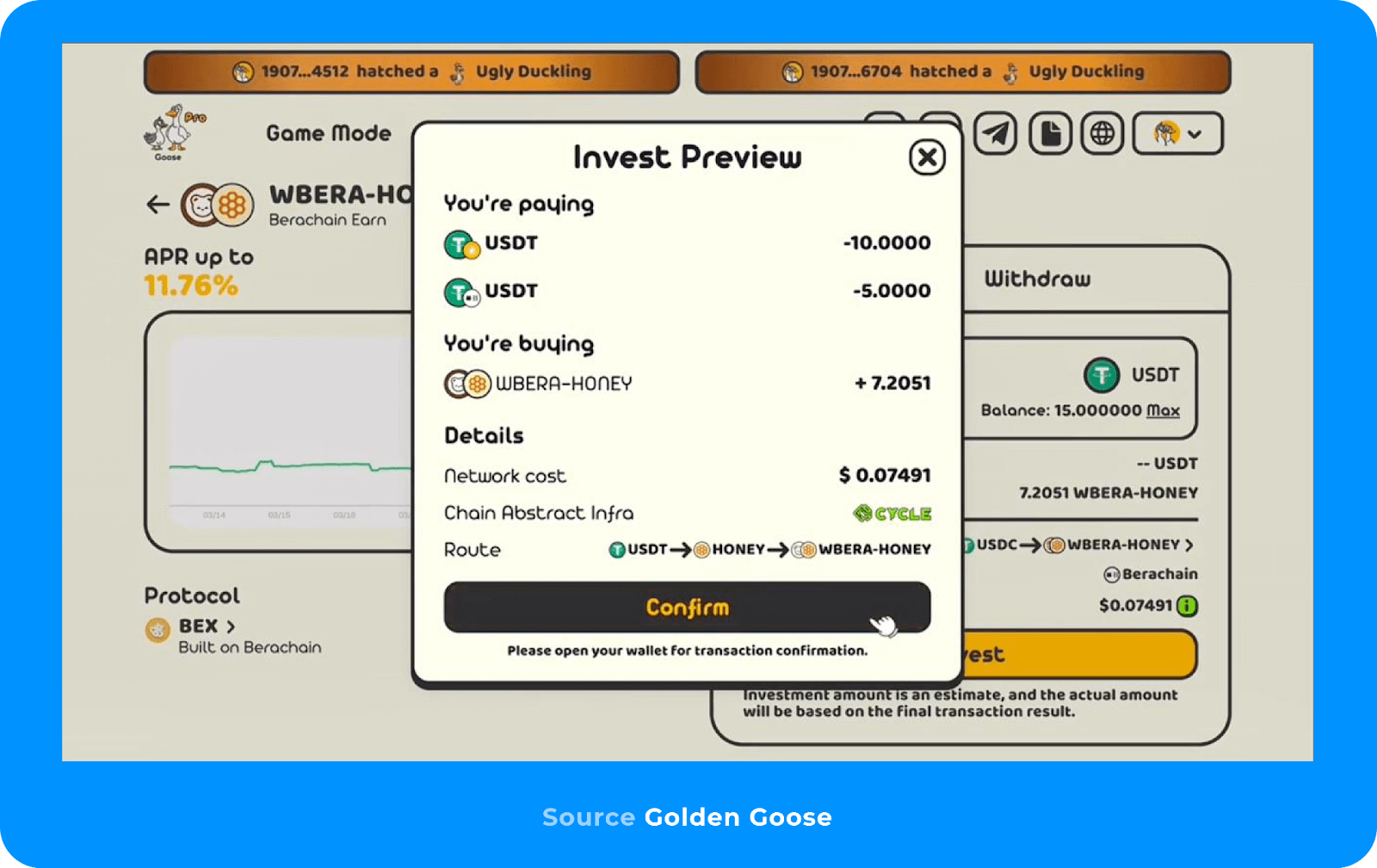골든 구스는 크로스체인 전략을 게임과 같은 경험으로 단순화하는 사이클 네트워크에 구축된 게임화된 DeFi 플랫폼이다. 사용자는 USDT와 같은 자산을 스테이킹하여 수익을 창출하는 가상 거위를 "부화"시키고, 보상 부스트를 위한 퀘스트를 완료하며, 사이클의 CYC 토큰 할당을 포함한 VEGOOSE 토큰과 에어드롭을 획득한다. 내부적으로 사이클은 브리징, 스와핑, 가스 지급, 유동성 제공, 스테이킹을 자동화한다. 여러 애플리케이션과 네트워크를 탐색하는 대신, 사용자는 단일 대시보드와 상호작용한다: 전략을 선택하고 "스테이크"를 클릭하면, 사이클이 롤인/롤아웃(Rollin/Rollout) 인프라와 통합 유동성 시스템을 사용하여 네트워크 간에 자산을 라우팅하며, 이는 사이클의 레이어로 자산을 이동시키거나 빼낸다.
