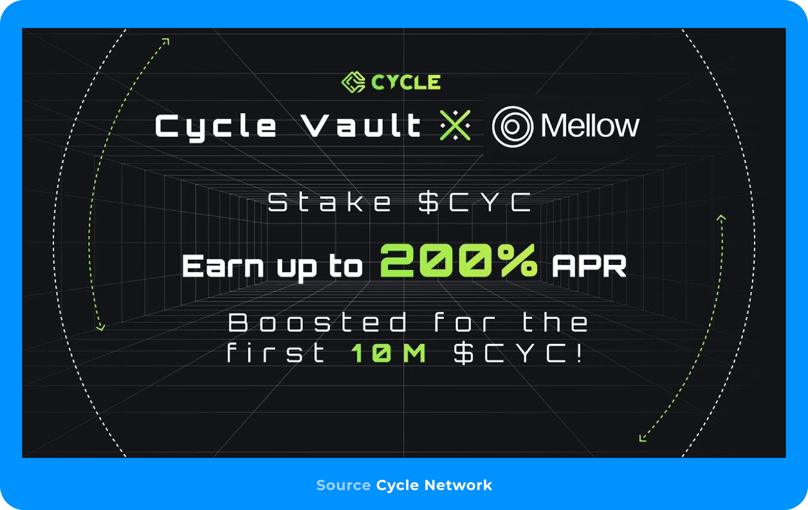 참가자에게 추가 보상을 제공하기 위해, 사이클은 사용자가 멜로우(Mellow)에서 CYC를 스테이킹하여 최대 200% APR을 받을 수 있는 멜로우 CYC 스테이킹 부스트를 도입하고 있다. 이 부스트는 에어드롭 보상을 기다리면서 커뮤니티 구성원이 생태계에 적극적으로 참여하도록 하는 추가 인센티브를 제공한다.
