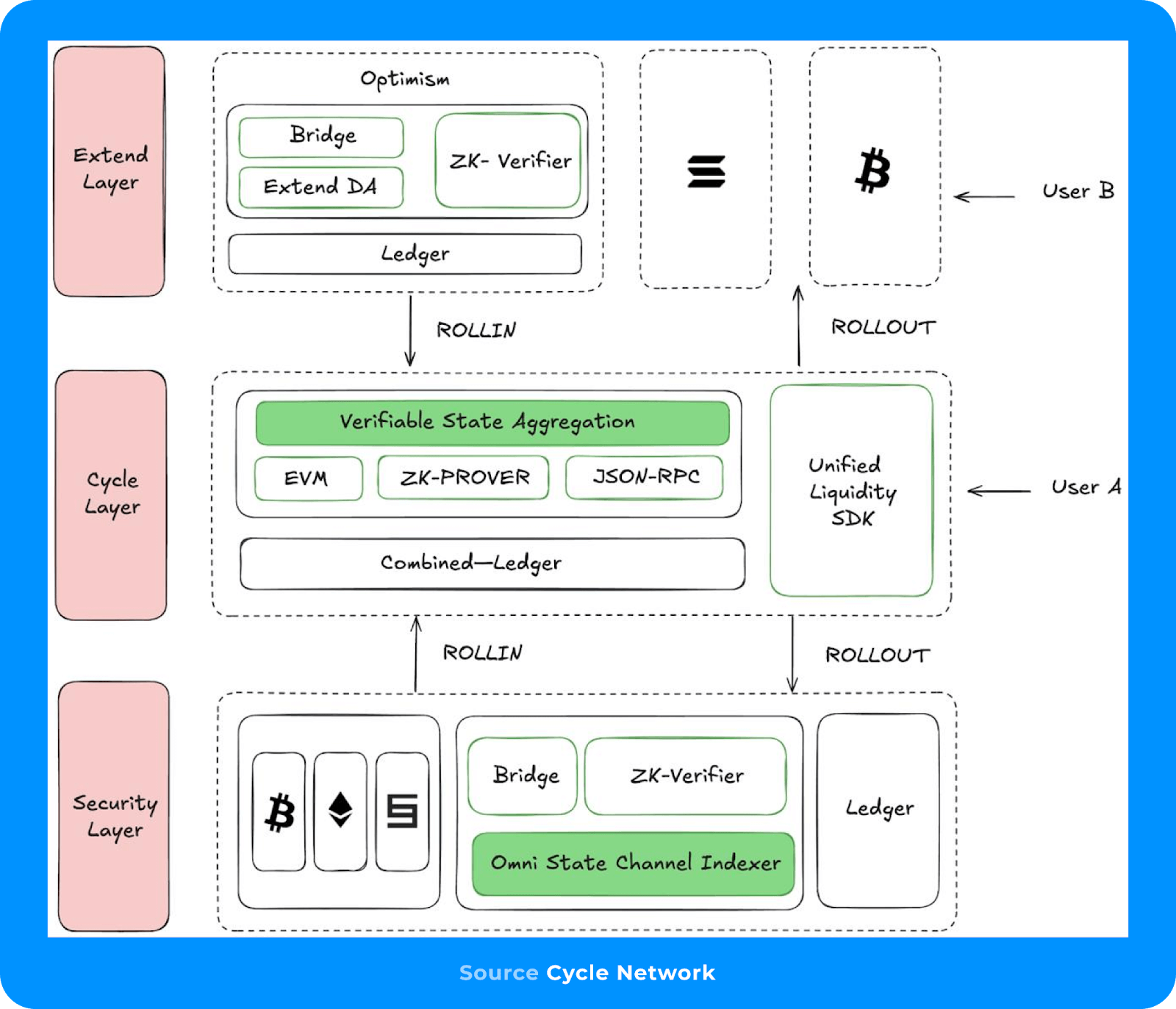 사이클의 아키텍처는 세 개의 레이어로 구성된다. 첫째, 보안 레이어(Security Layer)는 이더리움과 영지식 증명(ZKP)을 사용해 상태 무결성을 고정한다. 둘째, 확장 레이어(Extended Layers)는 탈중앙화 엔드포인트와 확장 데이터 가용성(EDA)을 통해 연결된 모든 소스 및 목적지 네트워크에 걸쳐 있다. 셋째, 사이클 레이어(Cycle Layer)는 네트워크 간 활동을 집계하는 zkEVM 롤업으로 기능한다. 이러한 레이어들은 함께 작동하여 동기화된 글로벌 상태를 유지하고 애플리케이션과 사용자가 단일 네트워크에서 운영하는 것처럼 네트워크 간 상호작용할 수 있도록 한다.
