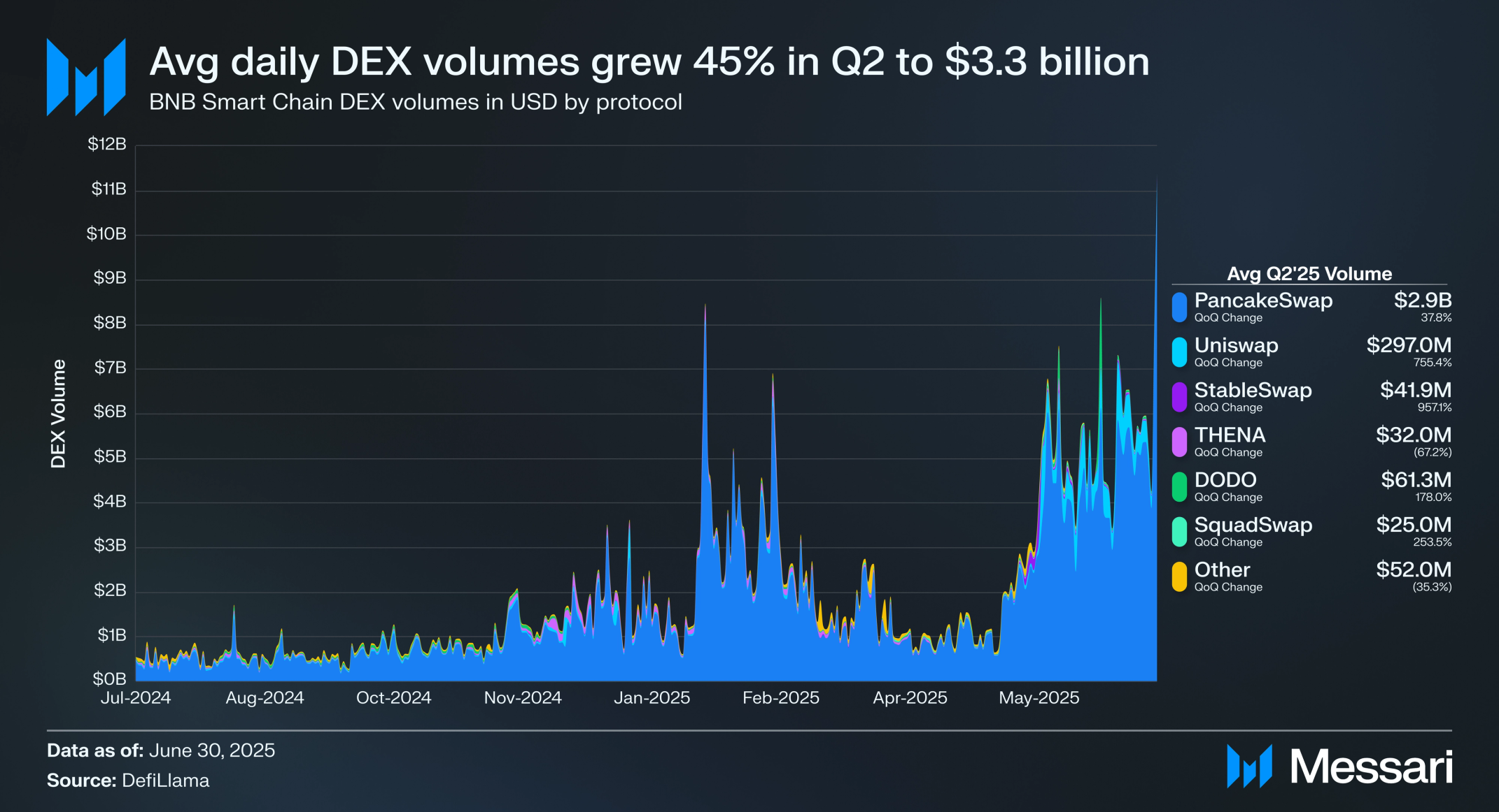 BNB 체인의 덱스 생태계는 2025년 2분기에 지속적인 모멘텀을 보였으며, 일평균 덱스 거래량이 전분기 대비 45.2% 상승하여 1분기 23억 달러에서 33억 달러로 증가했다. 이 성장으로 BNB 체인은 일평균 덱스 거래량 기준으로 모든 다른 체인 중 1위 자리에 올랐다.