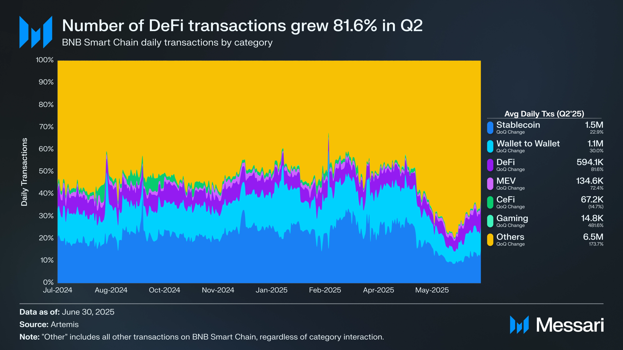 BNB 스마트 체인의 일평균 거래량은 2분기에 두 배 이상 증가하여 101.9% 상승한 990만 건을 기록했다. 역사적으로 가장 큰 단일 카테고리였던 스테이블코인 전송은 일평균 150만 건의 거래로 전분기 대비 22.9% 증가했다. 하지만 다른 분야의 성장으로 인해 총 거래에서 차지하는 비중은 24.2%에서 14.7%로 감소했다. 지갑 간 전송은 전분기 대비 30.0% 증가하여 110만 건을 기록했지만, 시장 점유율은 전분기 대비 35.6% 감소하여 11.0%가 되었다. 디파이 거래는 급격한 반등을 보여 전분기 대비 81.6% 상승하여 일일 594,100건에 도달했으며, 이는 이전 분기의 감소를 부분적으로 역전시키고 탈중앙화 금융 프로토콜에 대한 새로운 참여를 나타냈다.