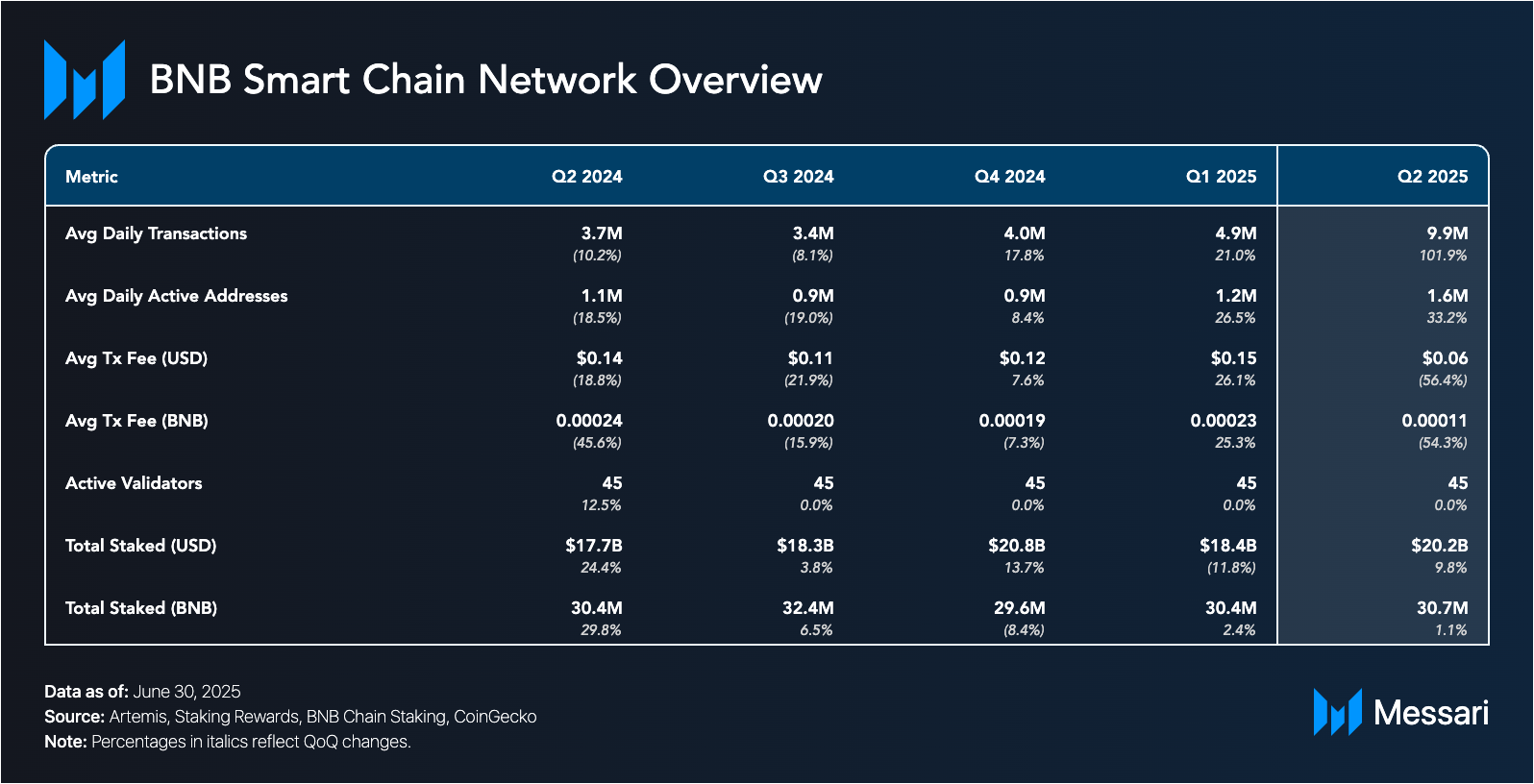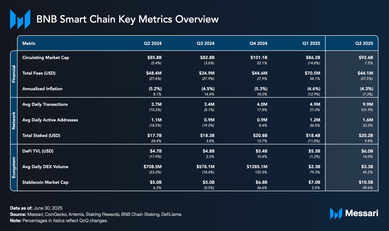 BNB 체인은 인프라 진전, 사용자 성장, 생태계 확장의 강한 조합으로 2025년 2분기를 마감했다. 네트워크 수익이 37.5% 감소했음에도 불구하고, BNB의 시가총액은 전분기 대비 7.5% 상승하여 네트워크의 장기 궤도에 대한 증가하는 신뢰를 반영했다. 네트워크 사용량이 급증하여 일평균 거래량이 두 배 이상 증가했고 스테이블코인 활동이 새로운 최고치에 도달했다. 이러한 메트릭들은 수수료 절감 노력과 증가한 처리량으로 인해 거래당 수익화가 감소했음에도 불구하고 광범위한 참여를 보여준다.