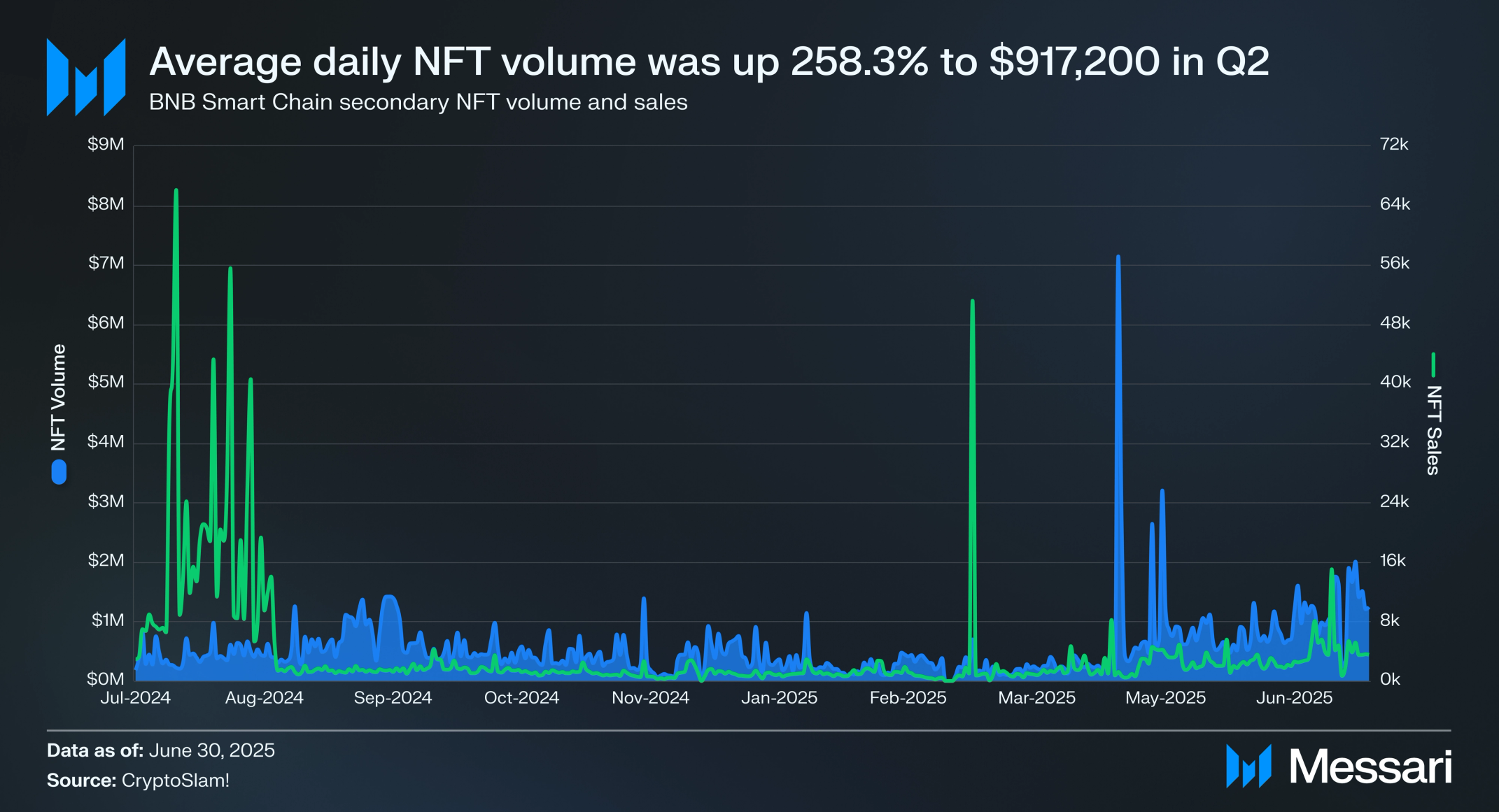 BNB 체인의 NFT 활동은 2025년 2분기에 강하게 반등했다. 일평균 NFT 거래량은 전분기 대비 258.9% 급증하여 1분기 256,000달러에서 917,200달러로 상승했다. 이는 2024년 3분기 이후 가장 높은 분기별 거래량을 나타내며 두 분기의 침체된 수요 이후 NFT 부문으로의 자본 회귀를 시사한다.
