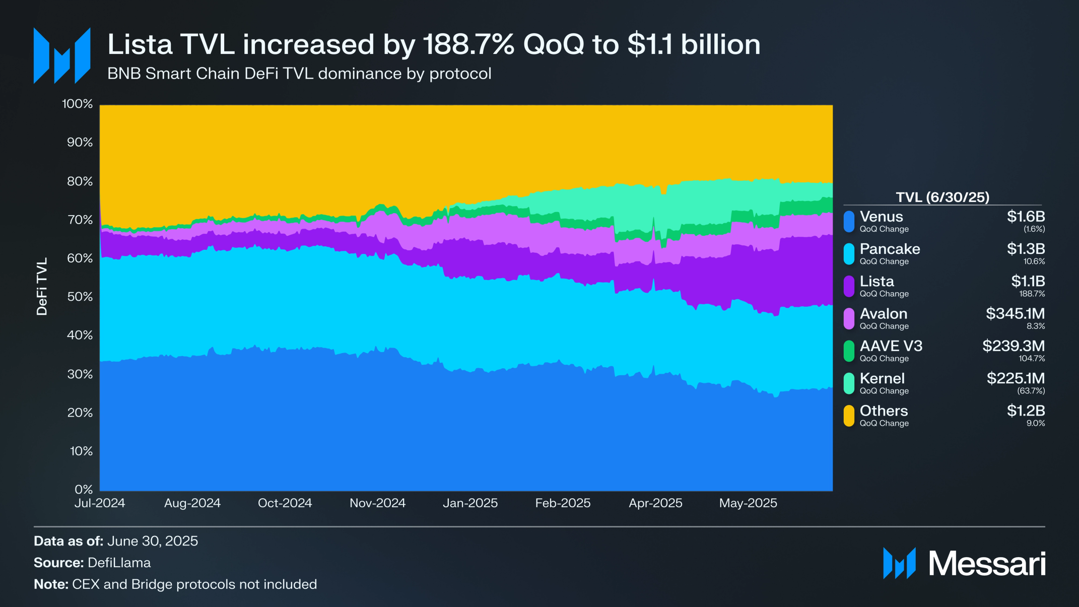 2025년 2분기 말까지, 비너스(Venus)와 팬케이크스왑(PancakeSwap)은 BNB 스마트 체인에서 TVL 기준으로 가장 큰 두 디파이 프로토콜로 남아 있었으며, 각각 16억 달러와 13억 달러의 TVL을 기록했다. 비너스는 머니 마켓에서의 지속적인 디레버리징에도 불구하고 선두를 유지하며 전분기 대비 1.6%의 소폭 감소를 보였다. 팬케이크스왑의 TVL은 AMM과 V3 제품 전반의 상승에 힘입어 전분기 대비 10.6% 증가했다.