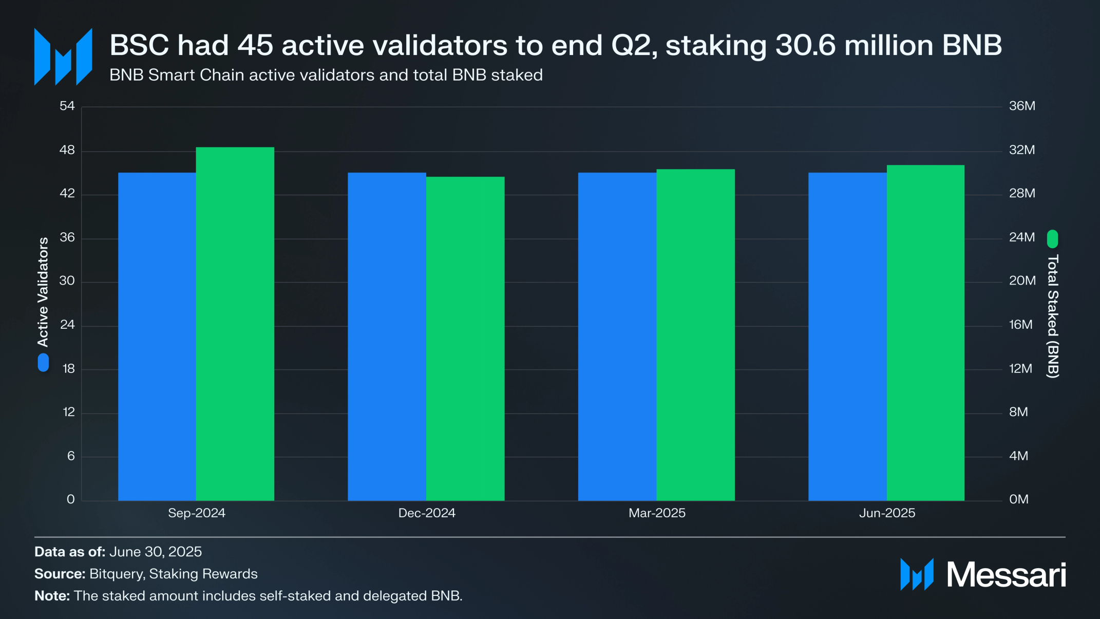 BNB 스마트 체인은 2025년 2분기 내내 45개의 활성 검증자로 구성된 전체 검증자 세트를 유지했으며, 이는 2024년 4월 파인만 업그레이드(Feynman Upgrade) 이후 상한을 40개에서 45개로 늘린 이후 일관된 상태다. 최대 용량에서의 지속적인 참여는 안정적인 검증자 참여와 신뢰할 수 있는 네트워크 보안 수준을 반영한다.
