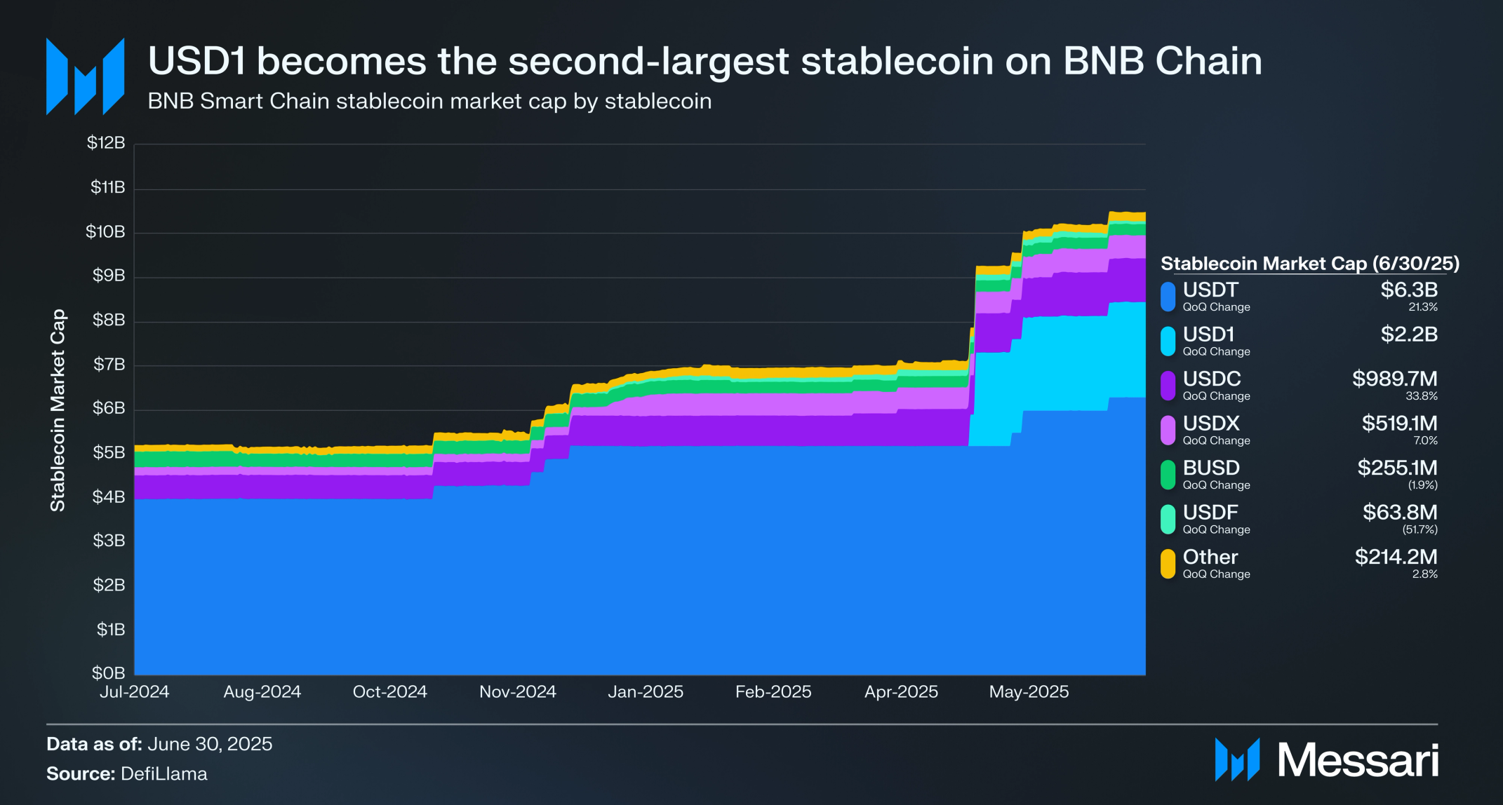 BNB 체인의 스테이블코인 시장은 2025년 2분기에 상당히 성장했으며, 총 스테이블코인 시가총액이 70억 달러에서 전분기 대비 49.6% 증가하여 105억 달러에 도달했다. 이는 2022년 이후 가장 큰 분기별 증가를 나타내며 BNB 체인을 이더리움과 트론(TRON)에 이어 스테이블코인 시가총액 기준으로 세 번째로 큰 네트워크로 위치시킨다.